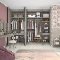 Ce dressing 5 espaces avec portes battantes toute hauteur Kazed trouvera facilement sa place dans votre pièce quelque soit l’espace disponible grâce à son option de mise à dimensions. Sa largeur et sa hauteur sont ajustables au mm près lui permettant de se glisser en intérieur ou en extérieur de niche. Sa profondeur de 595 mm (portes comprises) est fixe.
