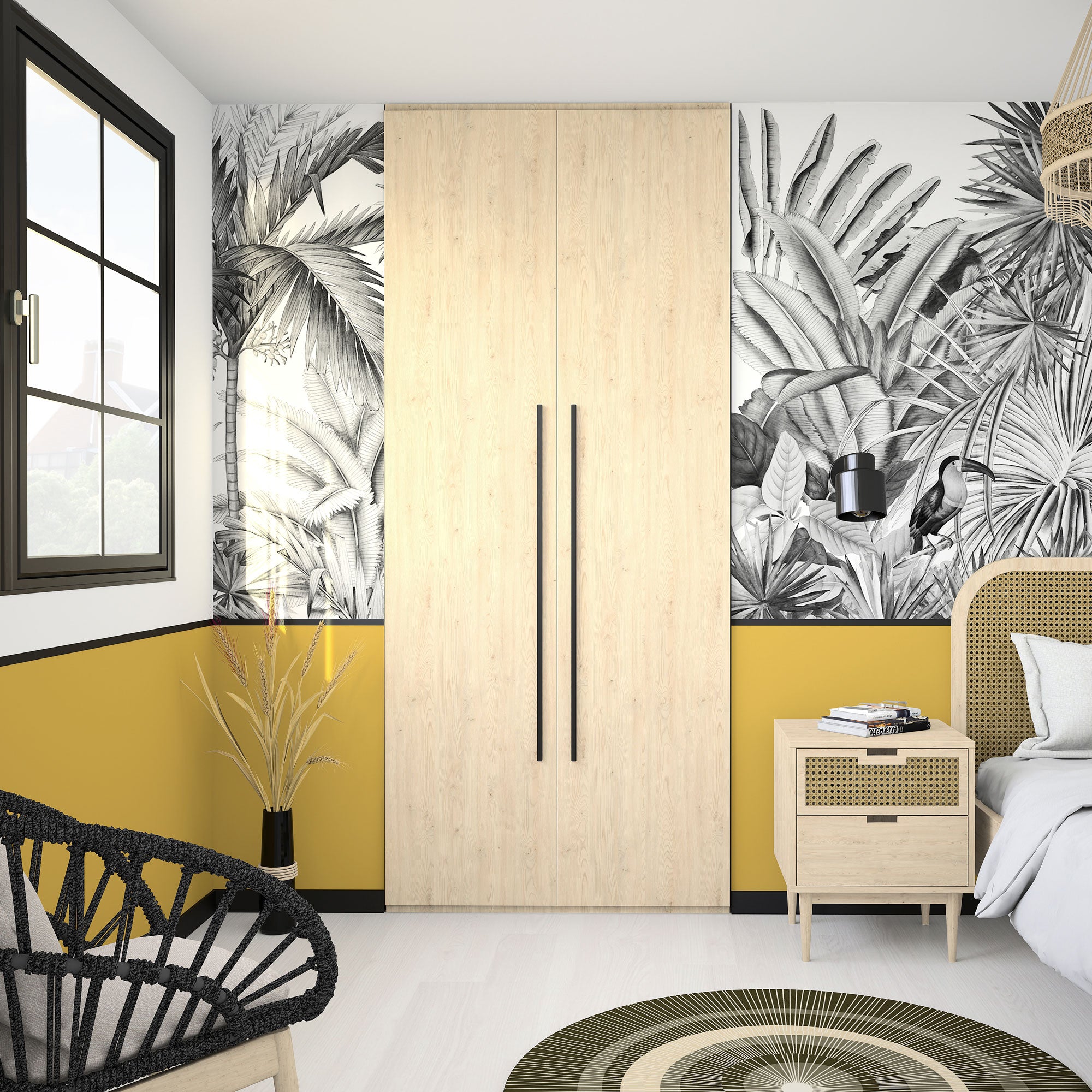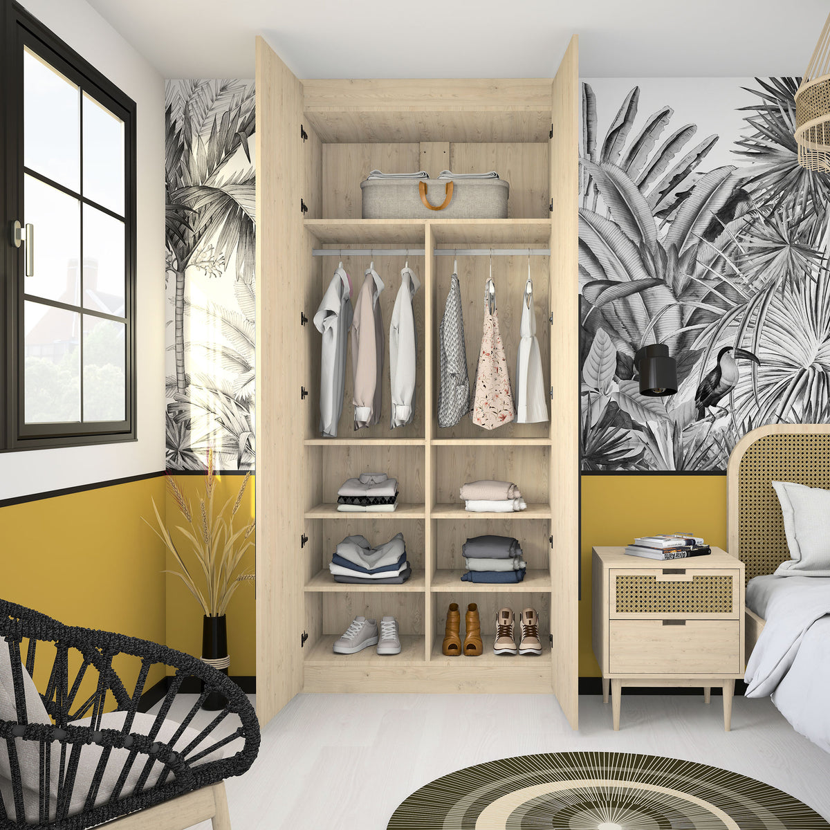 Aménagement composé de 2 tringles et 7 étagères. Son décor Châtaignier clair, chaleureux et lumineux, s’intégrera parfaitement à votre déco. Il s’harmonise avec tous les produits Kazed. Les poignées en aluminium brossé Noir lui confèrent un charme unique.