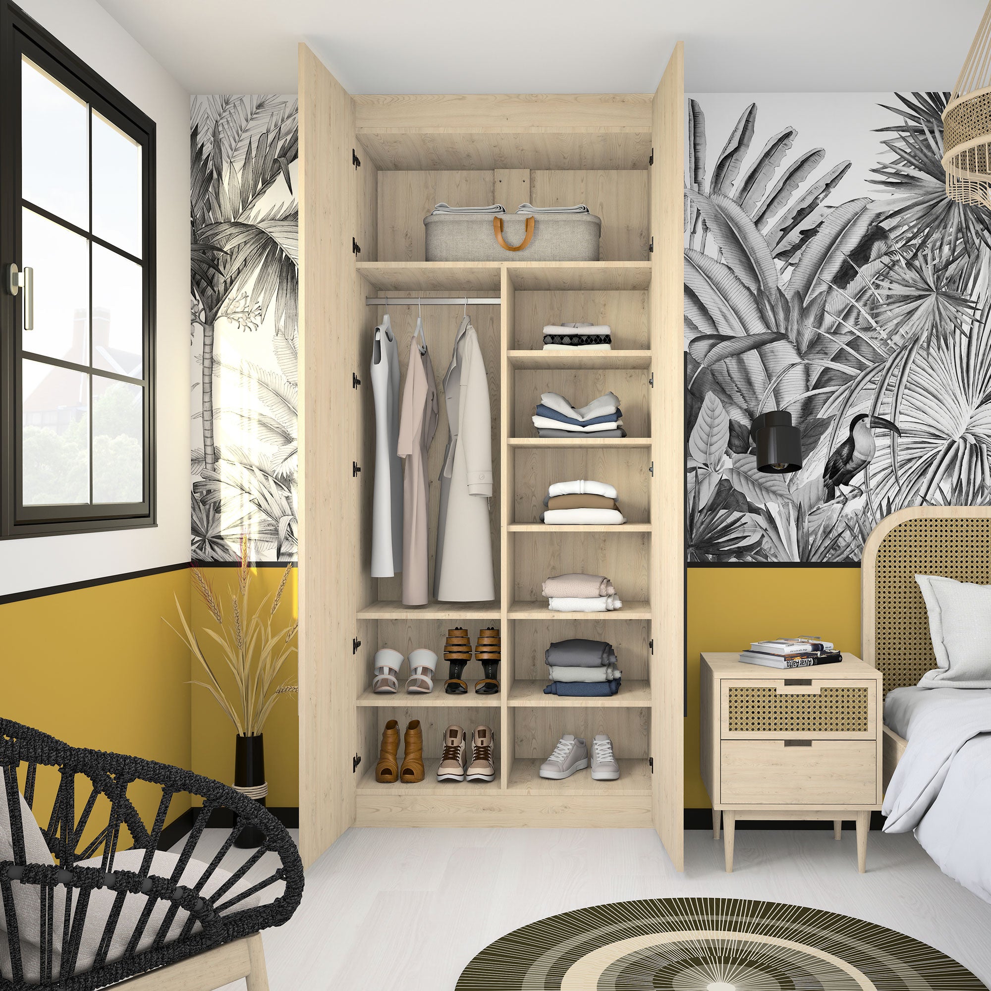 Aménagement composé de 1 tringle et 8 étagères. Son décor Châtaignier clair, chaleureux et lumineux, s’intégrera parfaitement à votre déco. Il s’harmonise avec tous les produits Kazed. Les poignées en aluminium brossé Noir lui confèrent un charme unique.