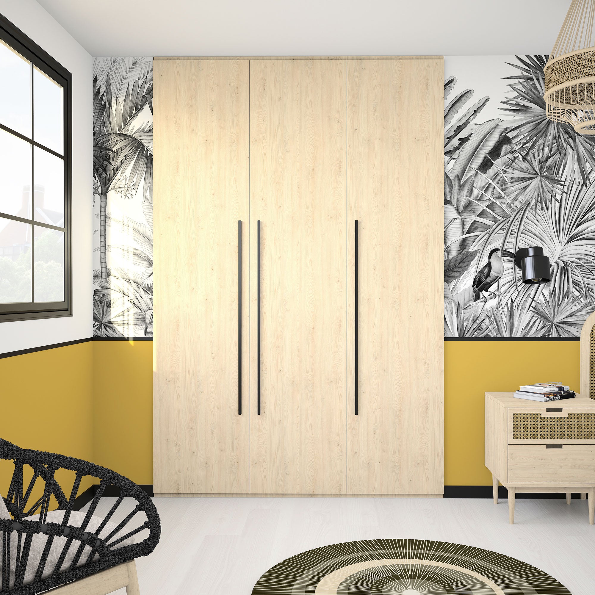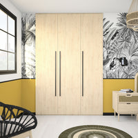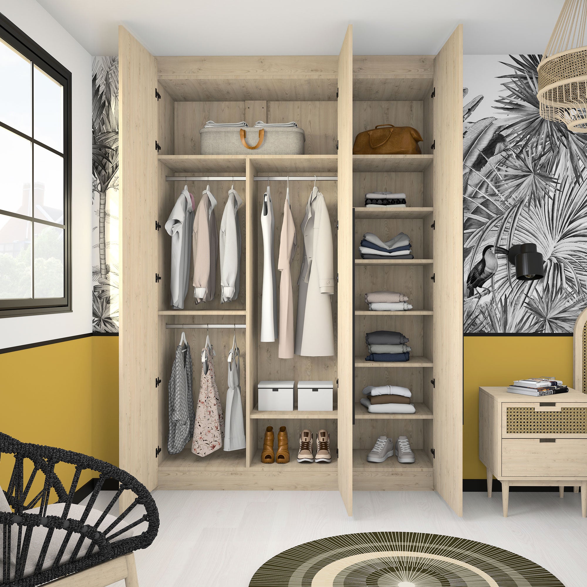 Aménagement composé de 3 tringles et 9 étagères. Son décor Châtaignier clair, chaleureux et lumineux, s’intégrera parfaitement à votre déco. Il s’harmonise avec tous les produits Kazed. Les poignées en aluminium brossé Noir lui confèrent un charme unique.