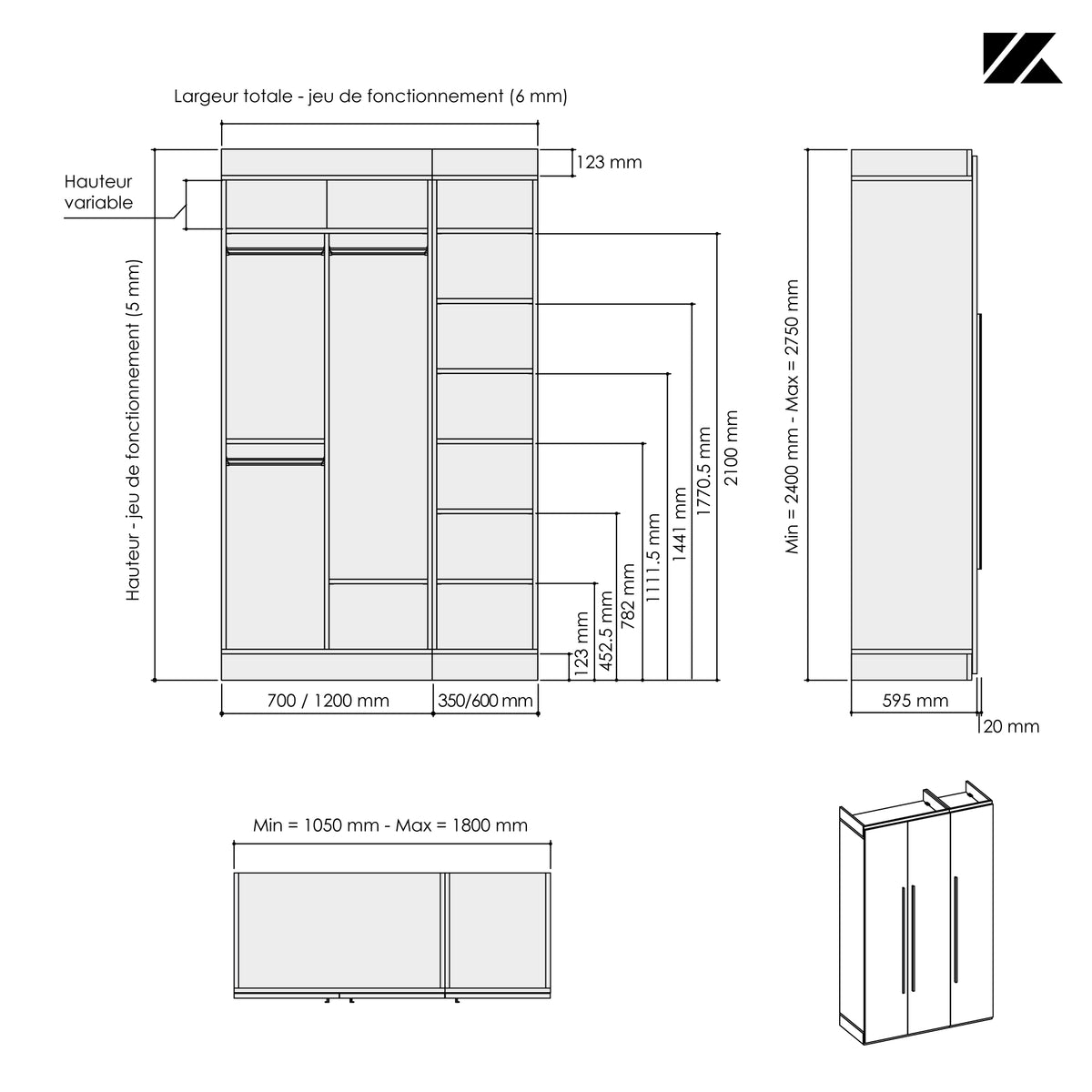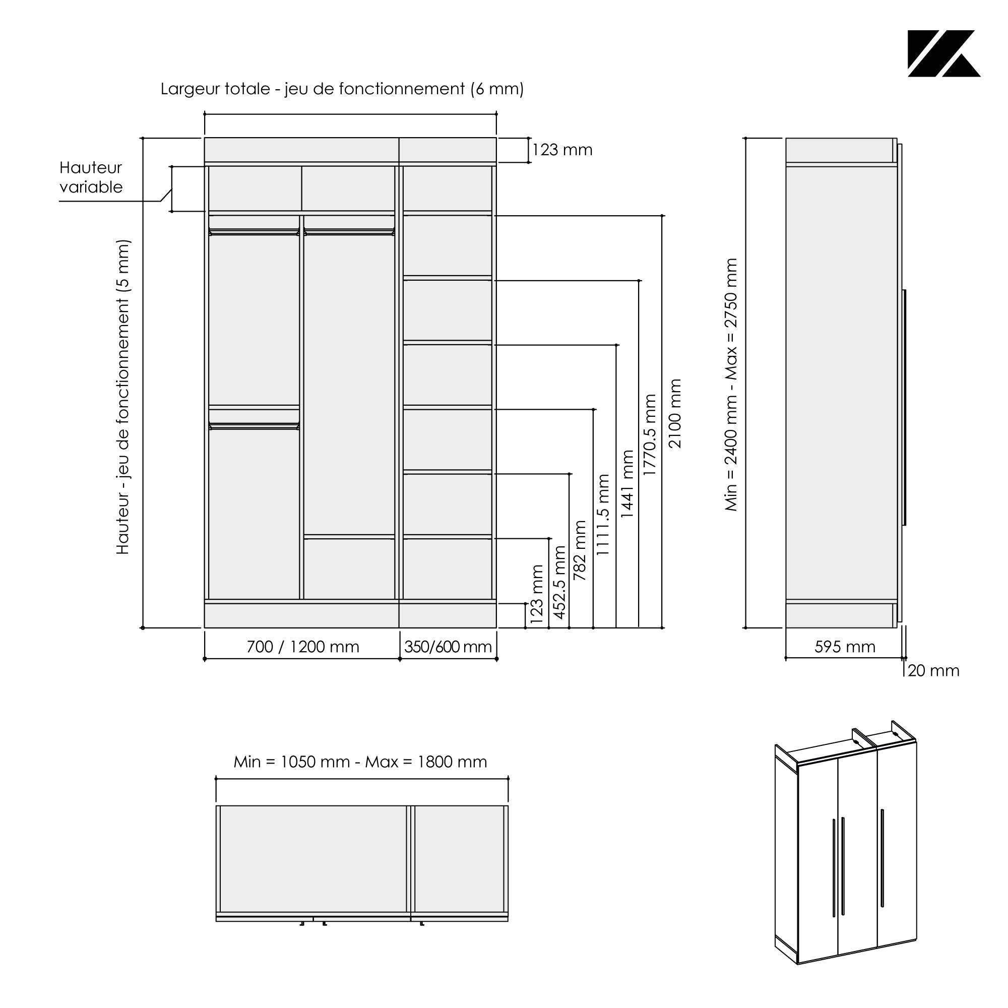 Ce dressing 3 espaces avec portes battantes toute hauteur Kazed trouvera facilement sa place dans votre pièce quelque soit l’espace disponible grâce à son option de mise à dimensions. Sa largeur et sa hauteur sont ajustables au mm près lui permettant de se glisser en intérieur ou en extérieur de niche. Sa profondeur de 595 mm (portes comprises) est fixe.