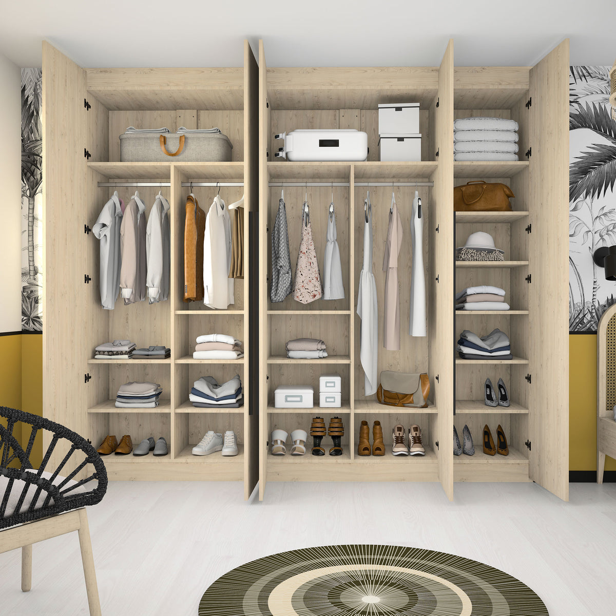 Aménagement composé de 4 tringles et 17 étagères. Son décor Châtaignier clair, chaleureux et lumineux, s’intégrera parfaitement à votre déco. Il s’harmonise avec tous les produits Kazed. Les poignées en aluminium brossé Noir lui confèrent un charme unique.