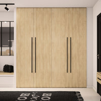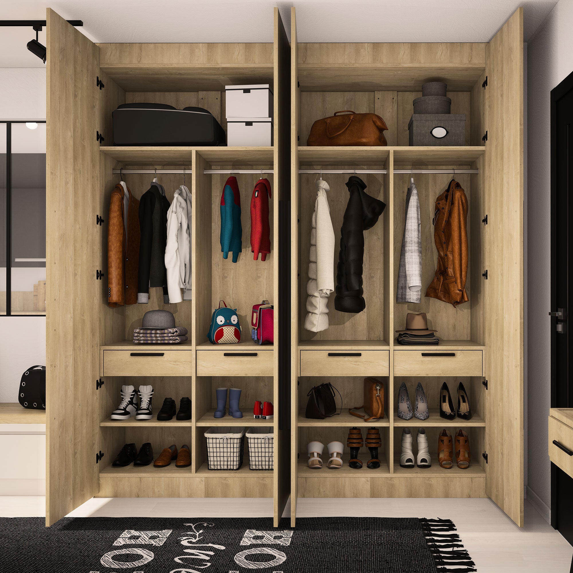 Aménagement composé de 4 tringles, 10 étagères et 4 tiroirs. Son décor Chêne blond, naturel et chaleureux, s’intégrera parfaitement à votre déco. Il s’harmonise avec tous les produits Kazed. Les poignées en aluminium brossé Noir lui confèrent un charme unique.