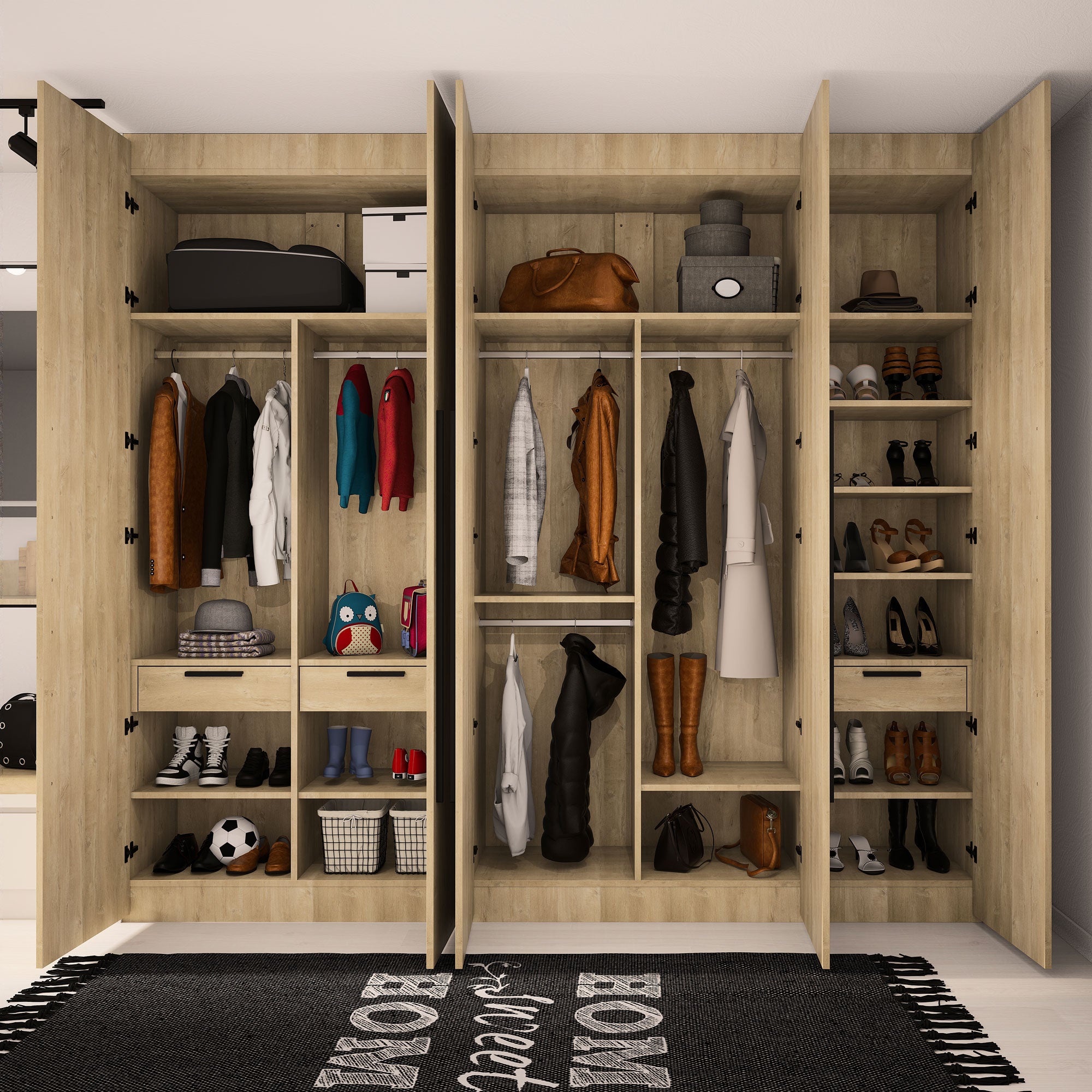 Aménagement composé de 4 tringles, 14 étagères et 3 tiroirs. Son décor Chêne blond, naturel et chaleureux, s’intégrera parfaitement à votre déco. Il s’harmonise avec tous les produits Kazed. Les poignées en aluminium brossé Noir lui confèrent un charme unique.
