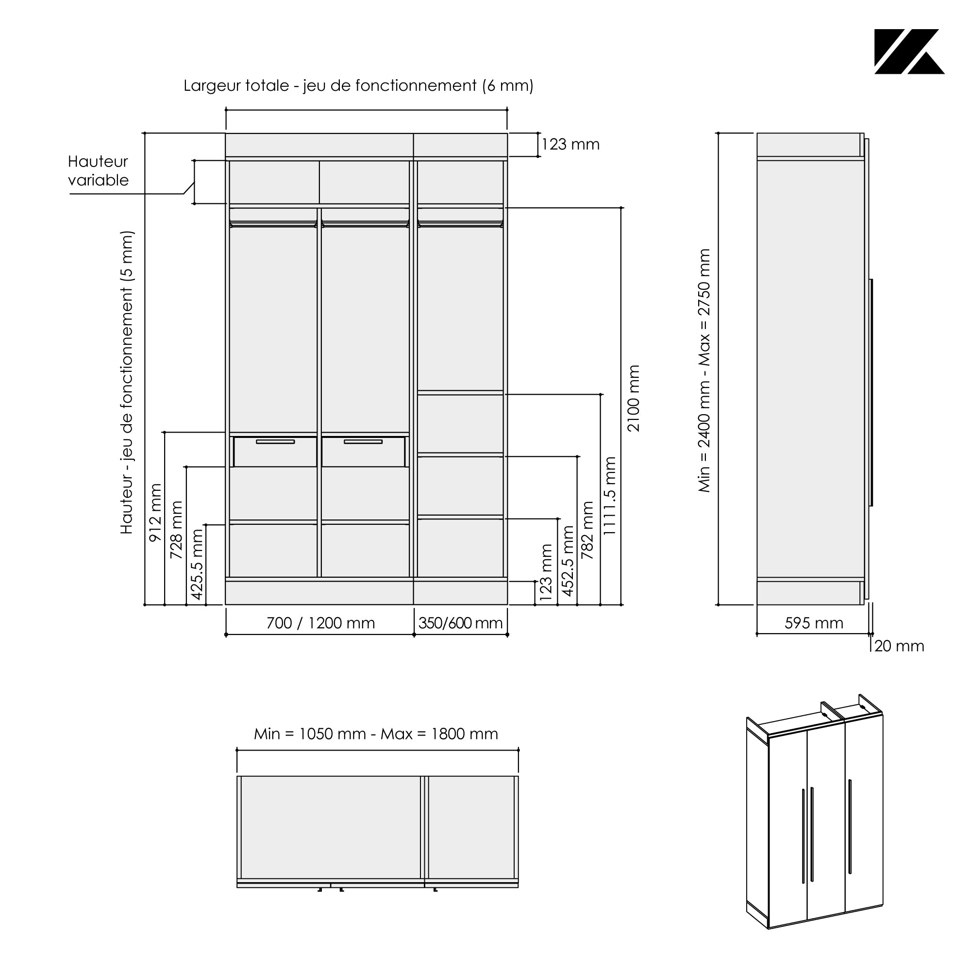 Ce dressing 3 espaces avec portes battantes toute hauteur Kazed trouvera facilement sa place dans votre pièce quelque soit l’espace disponible grâce à son option de mise à dimensions. Sa largeur et sa hauteur sont ajustables au mm près lui permettant de se glisser en intérieur ou en extérieur de niche. Sa profondeur de 595 mm (portes comprises) est fixe.