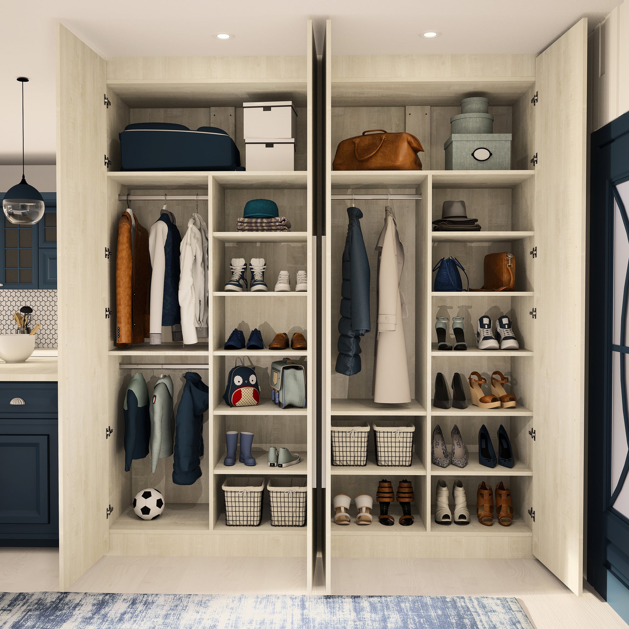 Cet aménagement est composé de 3 tringles et 15 étagères. Son décor Bois flotté crème, clair et doux à la fois, s’intégrera parfaitement à votre déco. Il s’harmonise avec tous les produits Kazed. Les poignées en aluminium brossé Naturel lui confèrent un charme unique.