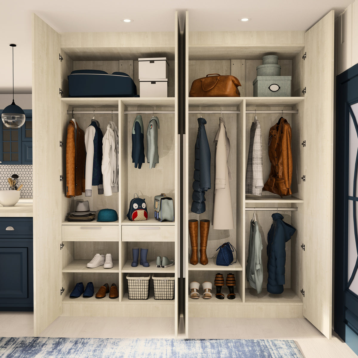 Cet aménagement est composé de 4 tringles, 8 étagères et 2 tiroirs. Son décor Bois flotté crème, clair et doux à la fois, s’intégrera parfaitement à votre déco. Il s’harmonise avec tous les produits Kazed. Les poignées en aluminium brossé Naturel lui confèrent un charme unique.