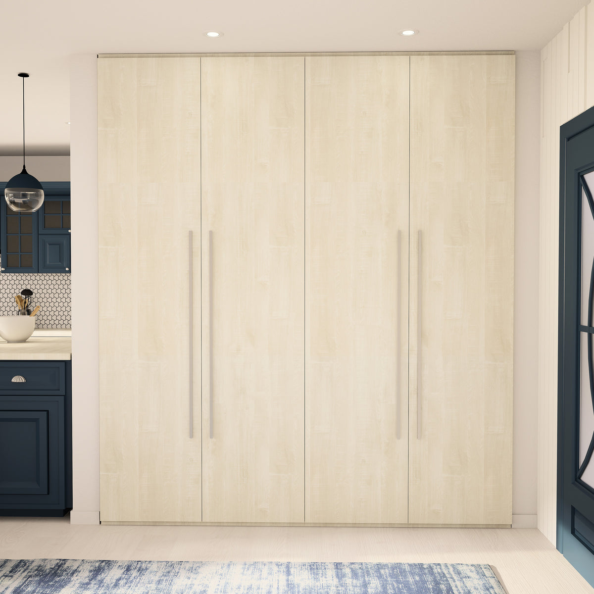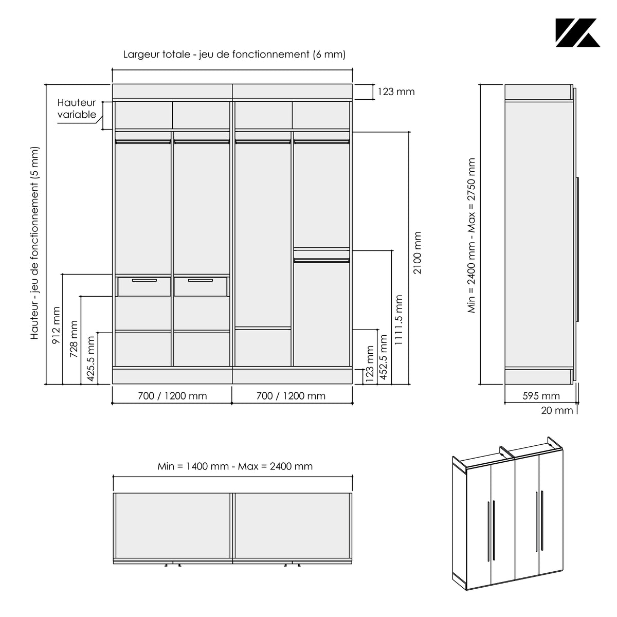Ce dressing 4 espaces avec portes battantes toute hauteur Kazed trouvera facilement sa place dans votre pièce quelque soit l’espace disponible grâce à son option de mise à dimensions. Sa largeur et sa hauteur sont ajustables au mm près lui permettant de se glisser en intérieur ou en extérieur de niche. Sa profondeur de 595 mm (portes comprises) est fixe.