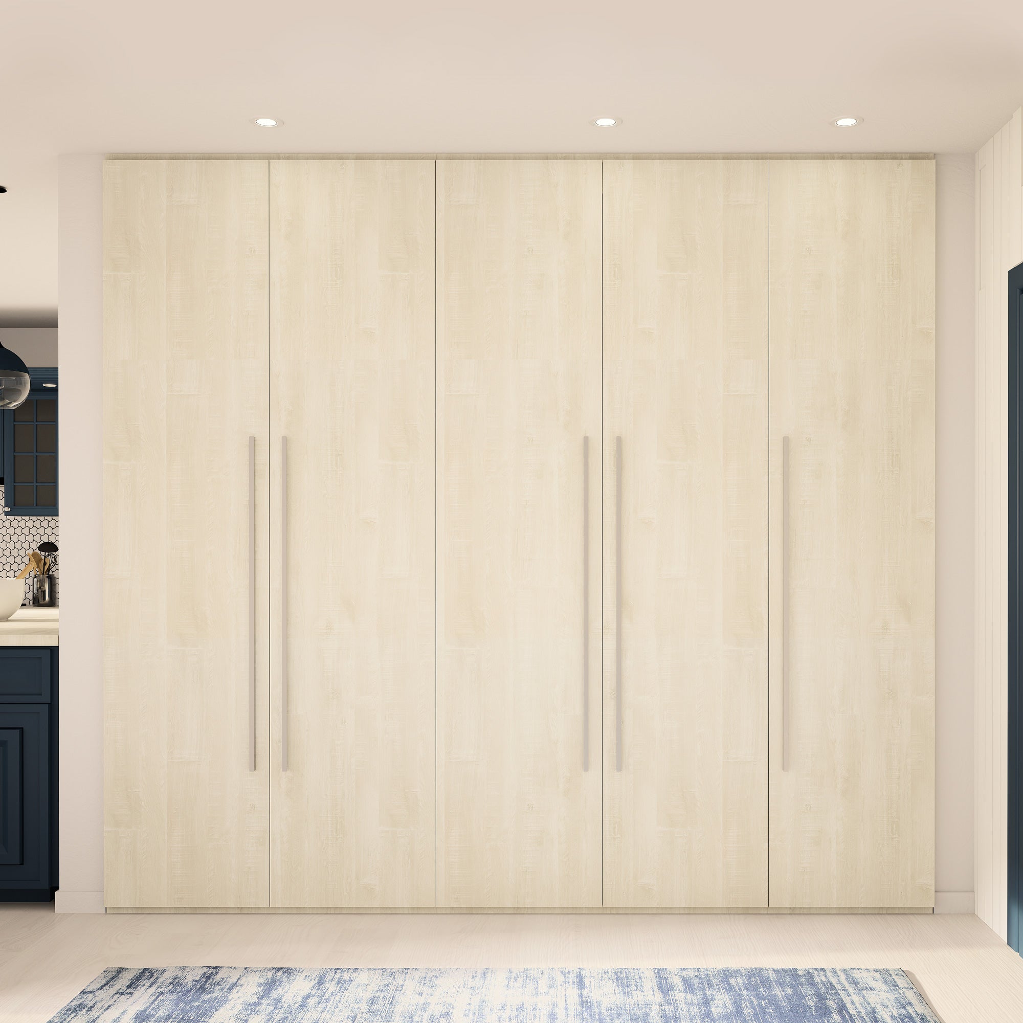 Cet aménagement est composé de 4 tringles et 17 étagères. Son décor Bois flotté crème, clair et doux à la fois, s’intégrera parfaitement à votre déco. Il s’harmonise avec tous les produits Kazed. Les poignées en aluminium brossé Naturel lui confèrent un charme unique.