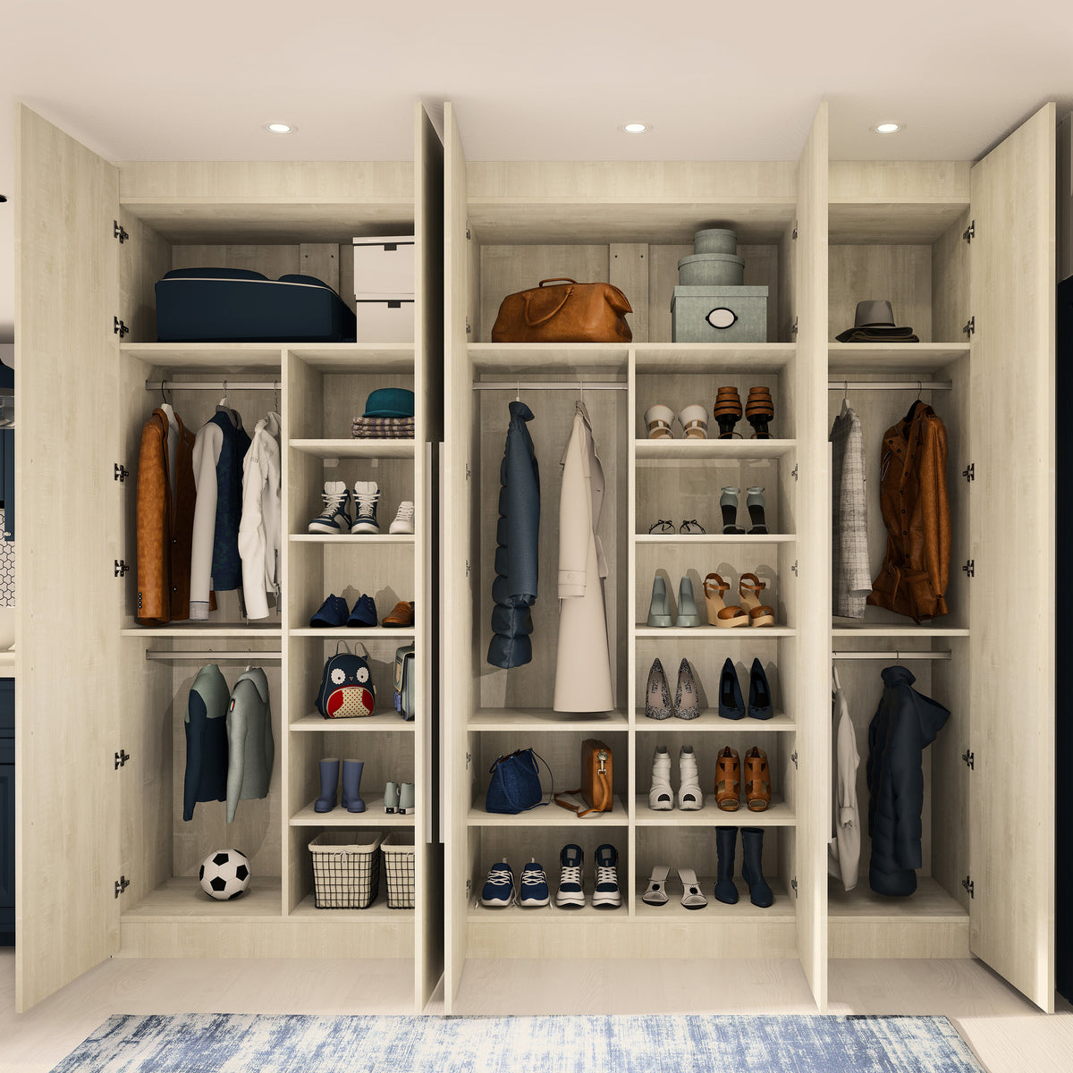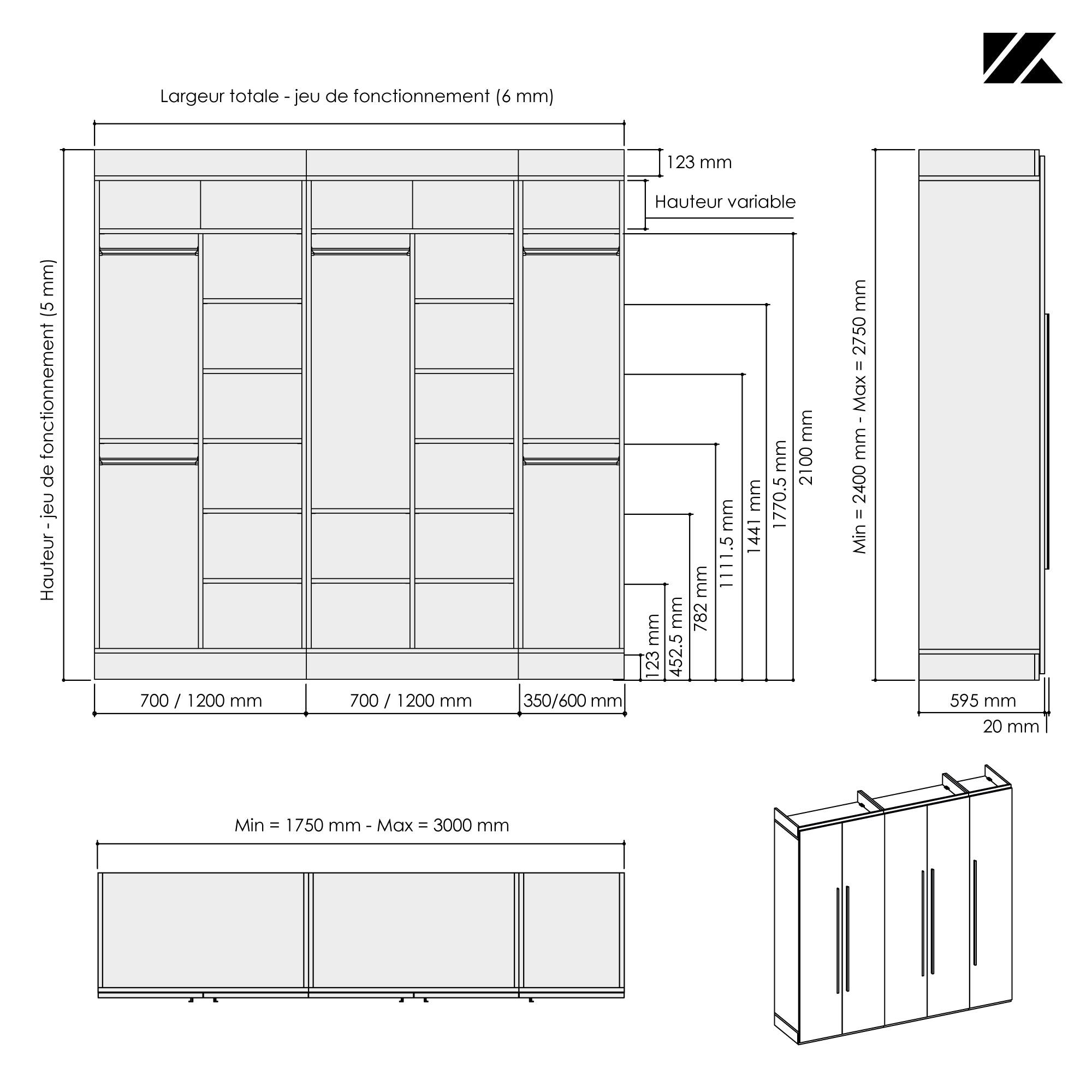 Ce dressing 5 espaces avec portes battantes toute hauteur Kazed trouvera facilement sa place dans votre pièce quelque soit l’espace disponible grâce à son option de mise à dimensions. Sa largeur et sa hauteur sont ajustables au mm près lui permettant de se glisser en intérieur ou en extérieur de niche. Sa profondeur de 595 mm (portes comprises) est fixe.