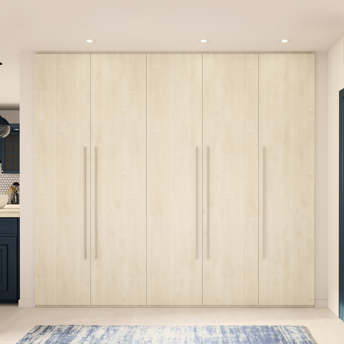 Cet aménagement est composé de 5 tringles et 14 étagères. Son décor Bois flotté crème, clair et doux à la fois, s’intégrera parfaitement à votre déco. Il s’harmonise avec tous les produits Kazed. Les poignées en aluminium brossé Naturel lui confèrent un charme unique.