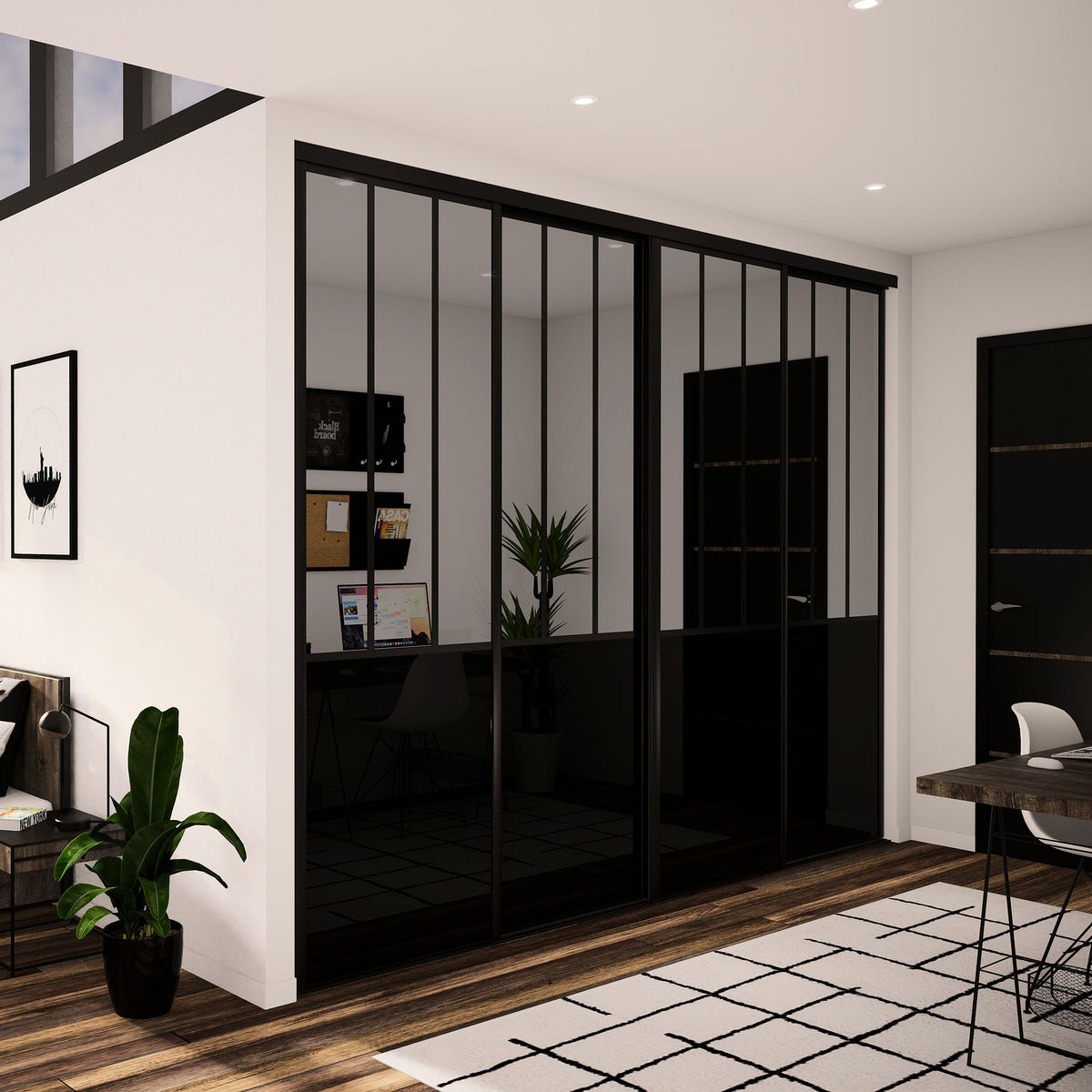 Le style atelier se décline joliment avec cette façade de placard coulissante dont le miroir plomb est sublimé par de jolies traverses verticales. Le verre laqué noir de la partie inférieure de la porte et des finitions en aluminium noir mat complètent une composition réussie !