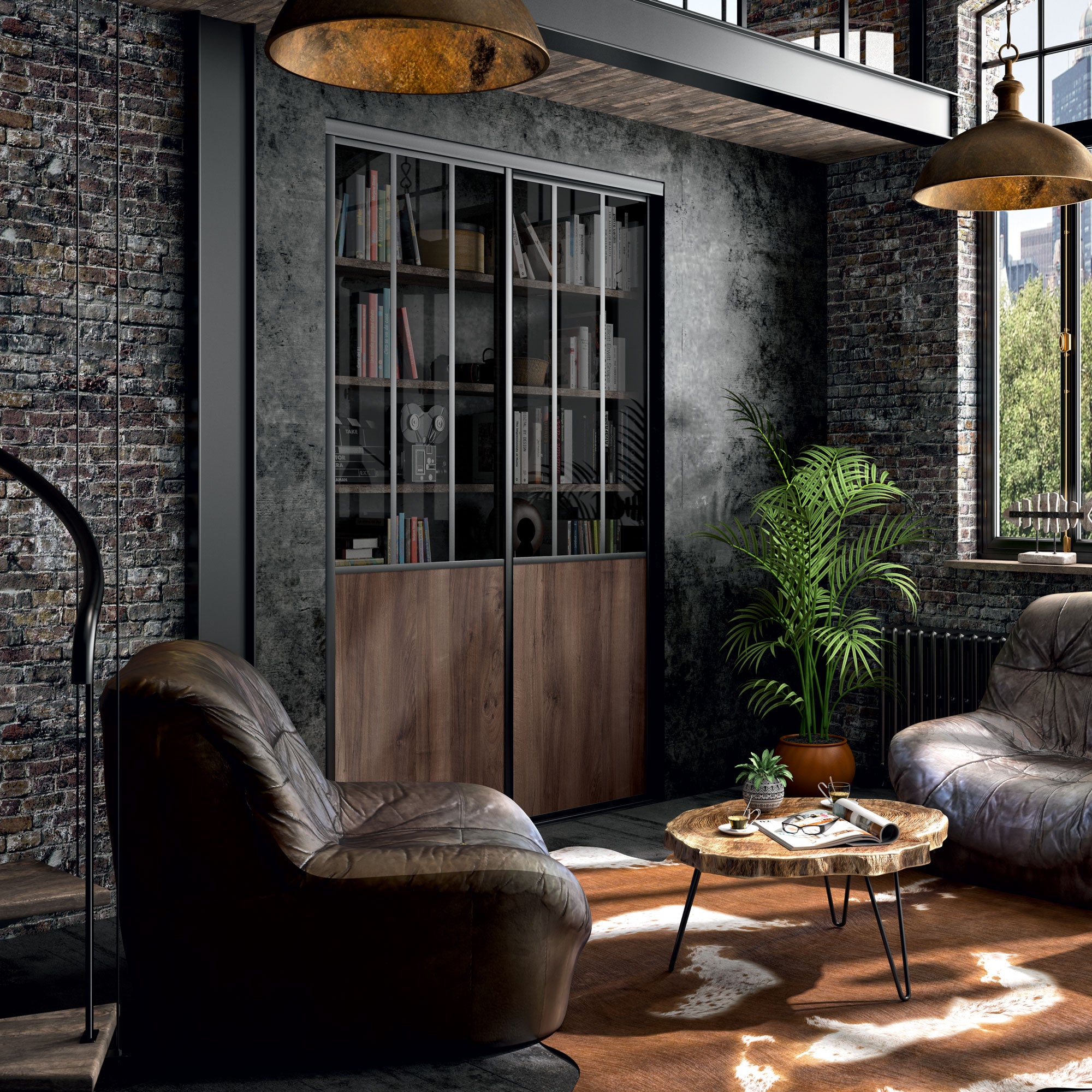 Cette façade de placard coulissante est composée de deux portes effet Noyer des Andes surplombées de vitres grisées et complétées d'une structure en aluminium noir mat. Elle revisite le style atelier dans un style vintage très tendance !