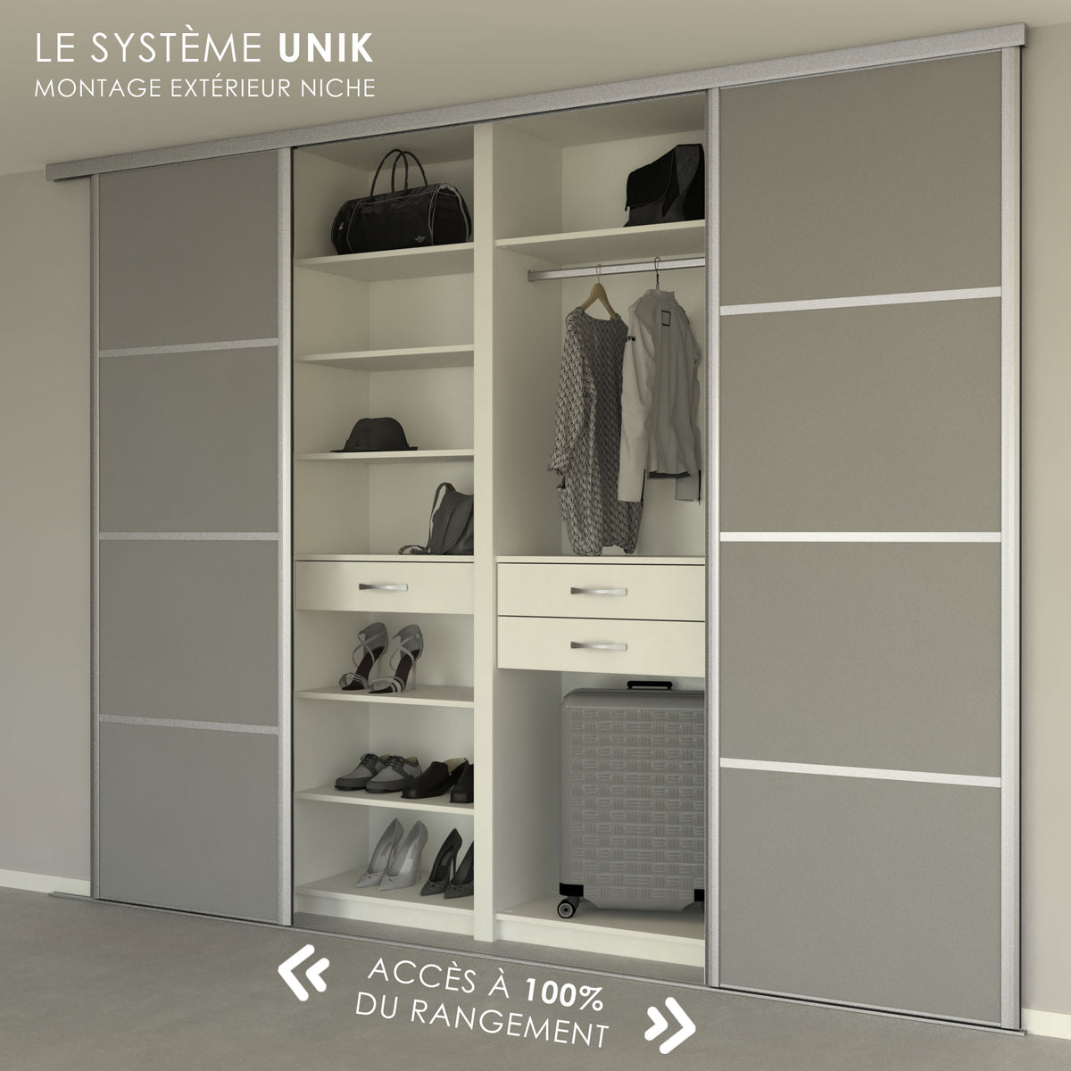 UNIK Extérieur : Installé à l’extérieur de la niche, cette façade est montée sur un rail haut et bas à une seule voie.