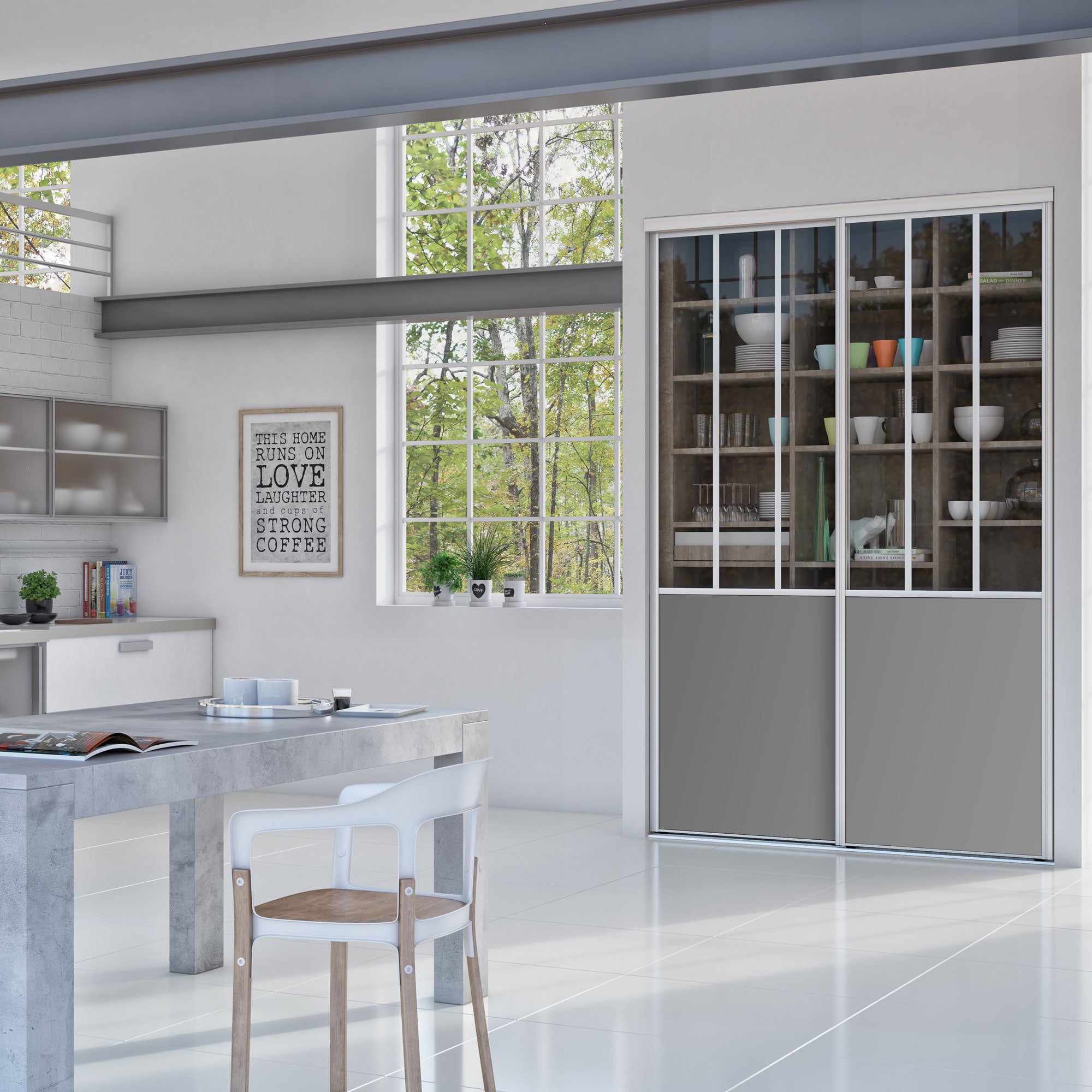 Apportez un style industriel avec cette façade de placard gris béton. Surmontée de vitres claires et de traverses verticales, elle revisite avec succès le style atelier. Les finitions en aluminium sont particulièrement soignées.