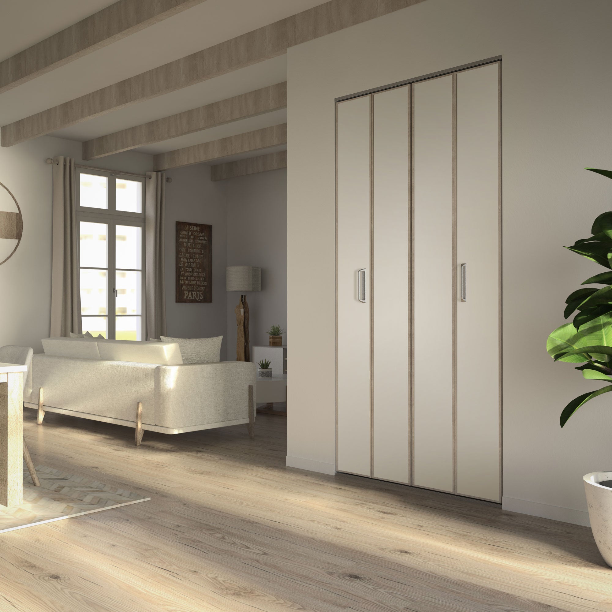 Vous recherchez un mariage qui fonctionne parfaitement en déco ? Le blanc mat mixé à des touches de chêne brut sur les décors apporte un parfait équilibre à vos portes de placard pliantes. Ses poignées en alu naturel sont très élégantes.