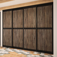 Succombez au style naturel et chic de ces portes de placard Kazed. Le contraste des matières est sublime avec les tons bois naturels et chaleureux de son décors effet Authentique brun, une traverse centrale et une finition Noir mat en aluminium qui souligne l’ensemble avec modernité.