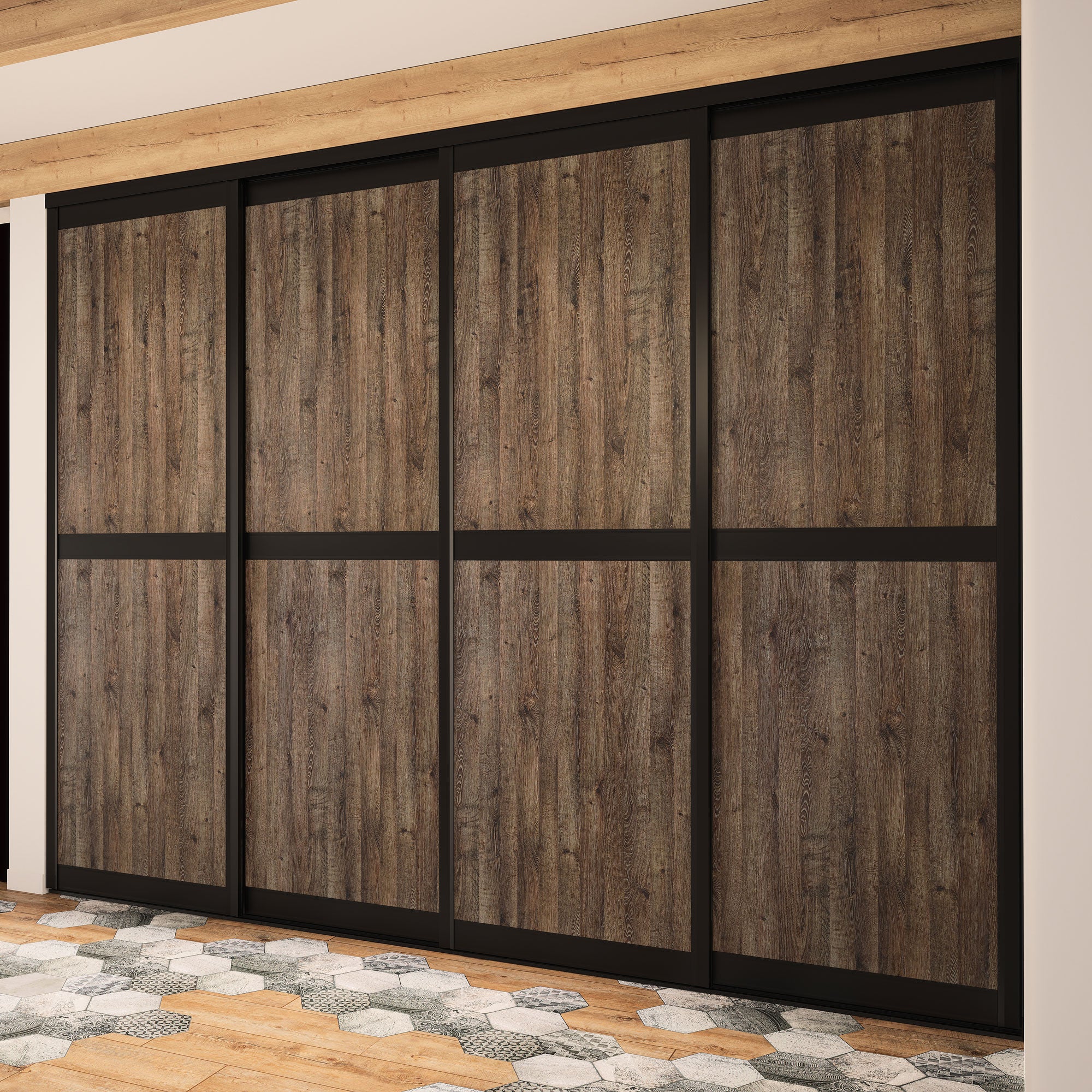 Cette façade de 4 portes de placard coulissantes est idéale pour les espaces de rangement supérieurs à 4 mètres de large.