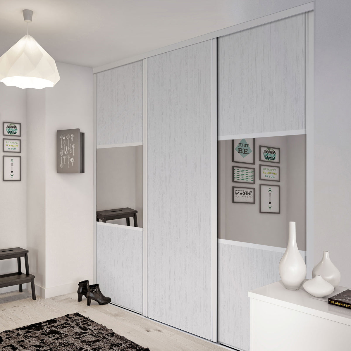 Sur ces portes de placard coulissantes, l’association du miroir Argent et de l’effet bois Zebrano blanc est sublimée par des finitions remarquables en aluminium Blanc mat. Ces tons clairs illumineront votre entrée tout en élégance.
