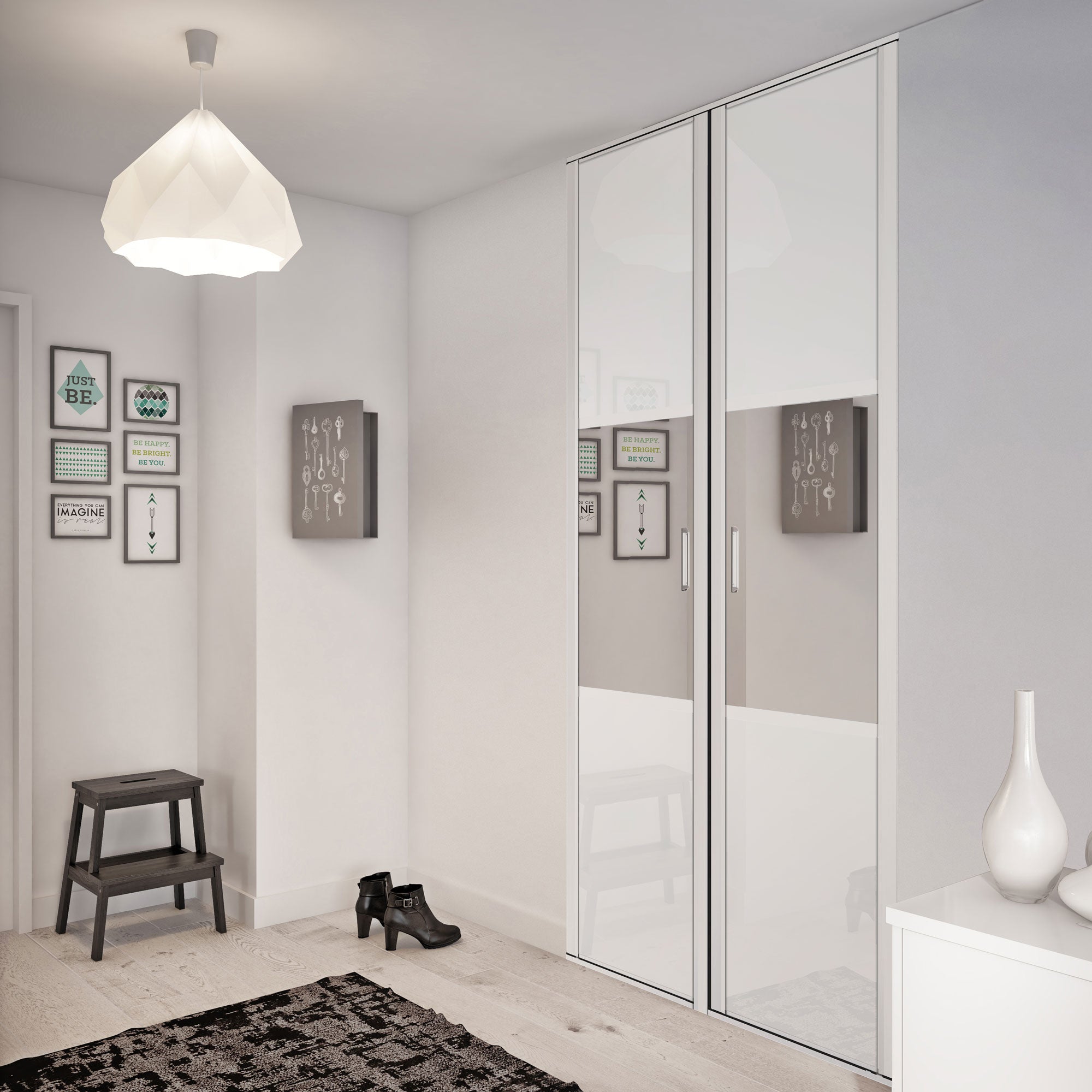 Quoi de mieux pour faire resplendir un intérieur que ce mariage de verre laqué blanc pur et de miroirs centraux argent ? La finition en alumium blanc mat renforce l'effet lumineux de ces deux portes de placard pivotantes.