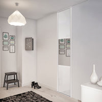 Quoi de mieux pour faire resplendir un intérieur que ce mariage de verre laqué blanc pur à un miroir central argent ? La finition en alumium blanc mat renforce l'effet lumineux de cette porte de placard pivotante.