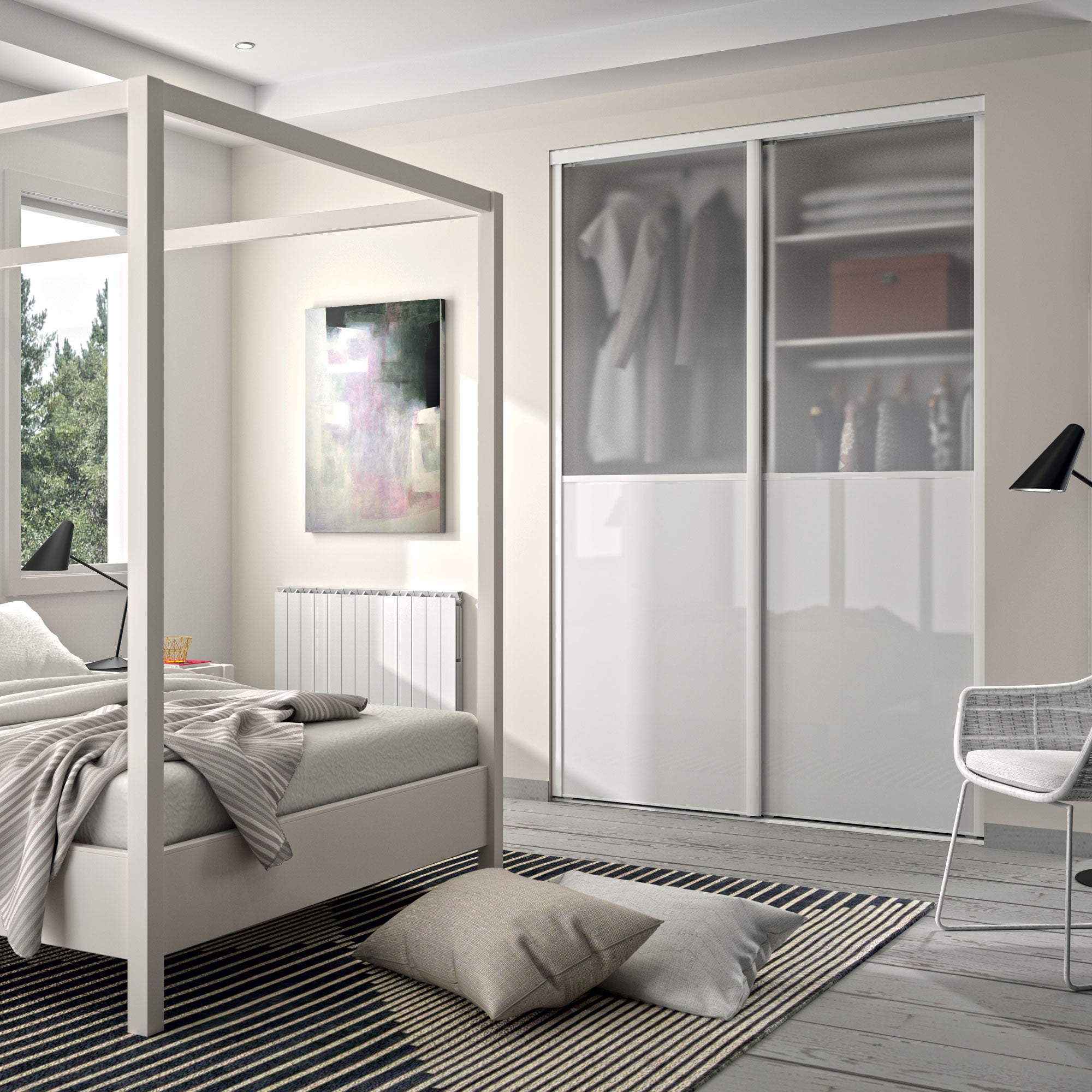 Les mystères du cercle polaire Artique se révélent dans votre chambre ! La vitre dépolie de cette façade de placard coulissante mettra subtilement en valeur un dressing. Le verre laqué blanc pur et les finitions en aluminium assorties forment un duo vivifiant !