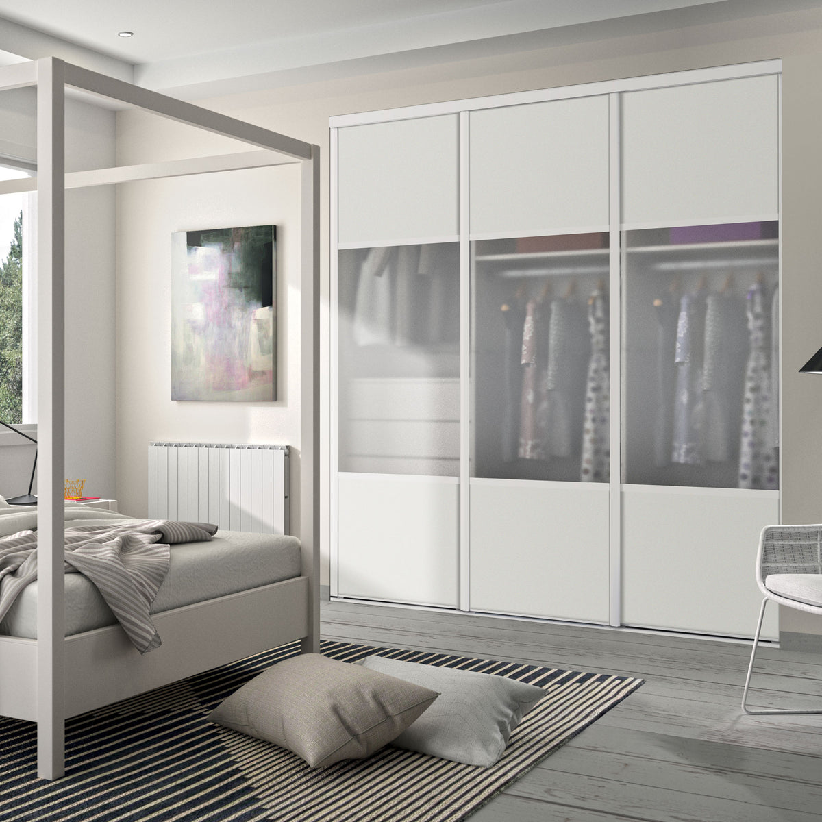 Les mystères du cercle polaire Artique se révélent dans votre chambre ! Centrale, la vitre dépolie de cette façade de placard coulissante mettra subtilement en valeur un dressing. Le blanc mat et les finitions en aluminium assorties forment un duo vivifiant !