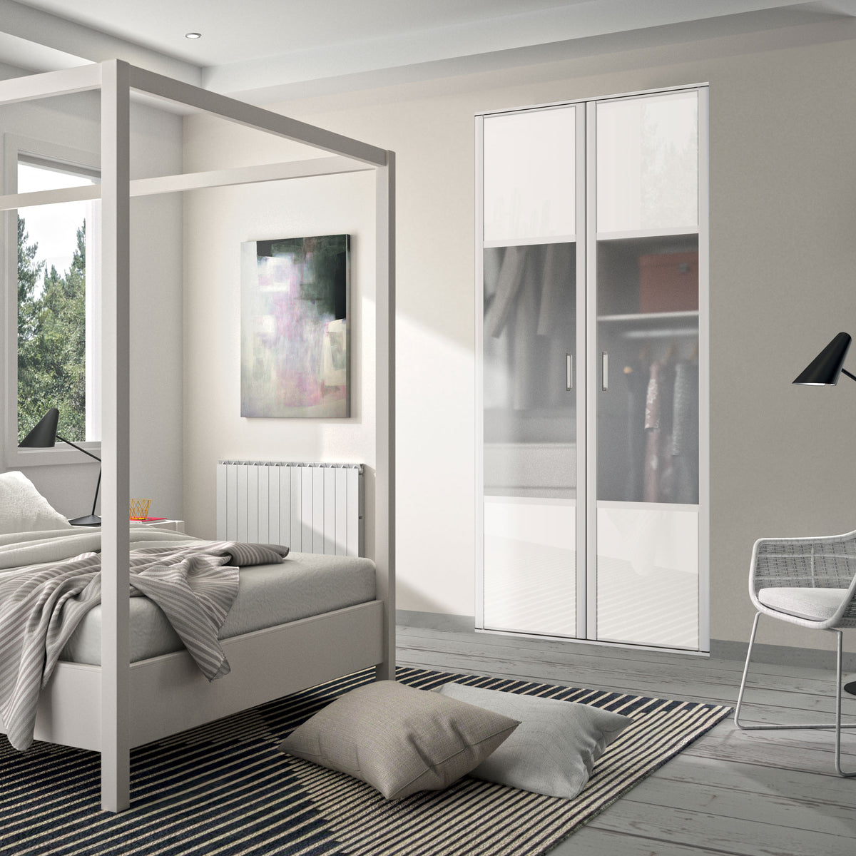 Les mystères du cercle polaire Artique se révélent dans votre chambre ! Centrale, la vitre dépolie de cette façade de placard pivotante mettra subtilement en valeur un dressing. Le verre laqué blanc pur et les finitions en aluminium assorties forment un duo vivifiant !