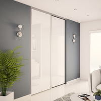 Valeur sûre, le blanc se marie à tout type de décoration. Cette façade de placard coulissante en verre laqué blanc pur fera souffler un vent frais sur votre décoration. Ce style très contemporain est mis en valeur par des finitions haut de gamme en aluminium.