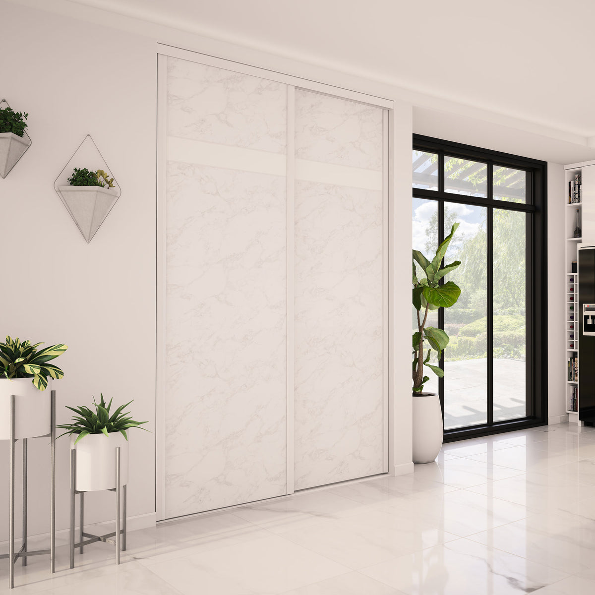 Pour une ambiance zen et pure, adoptez ces portes de placard coulissantes. Elles associent l’effet Marbre très chic au Blanc mat intemporel de la frise. Les finitions et les traverses fines sont en Aluminium Blanc mat.