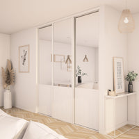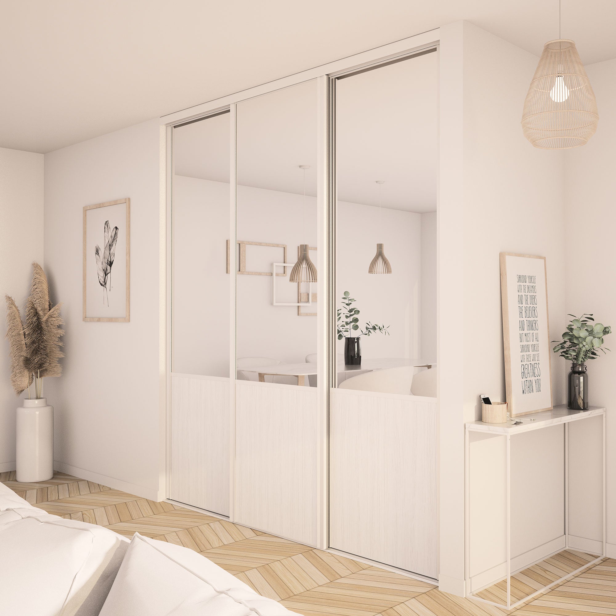 Toute en élégance, cette façade de placard se compose d’un brillant miroir Argent, contrasté par la douceur du décor bois clair Zebrano blanc. La structure en aluminium Blanc mat sublime l’ensemble pour une intégration parfaite dans votre intérieur.