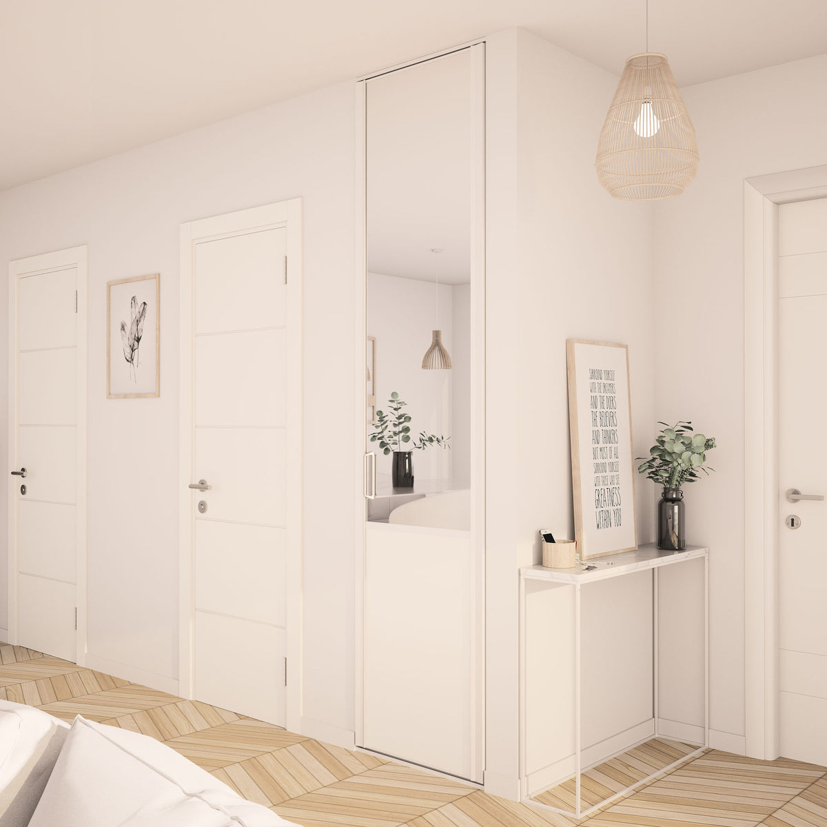 Simple mais efficace ! Cette porte de placard pivotante Kazed très lumineuse grâce à son grand miroir Argent est contrastée par la pureté du décor Blanc mat. La structure en Aluminium Blanc mat s’harmonise parfaitement avec l’ensemble.