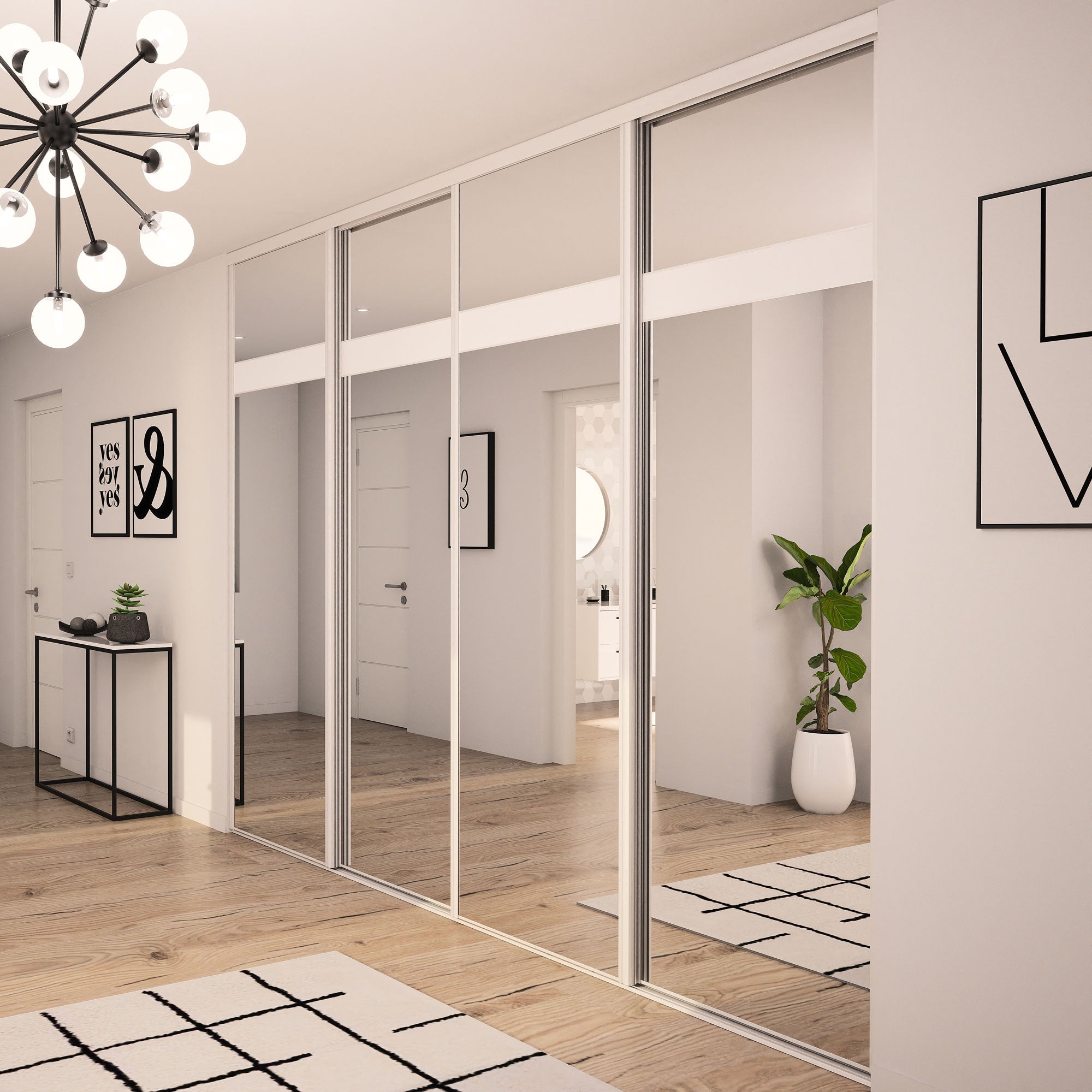 Accord parfait pour cet ensemble miroir Argent et frise haute Blanc mat ! Ces portes de placard coulissantes trouveront facilement leur place chez vous. En aluminium Blanc mat, leur structure offre une finition haut de gamme.Dim. : H2500 x L3200 mm