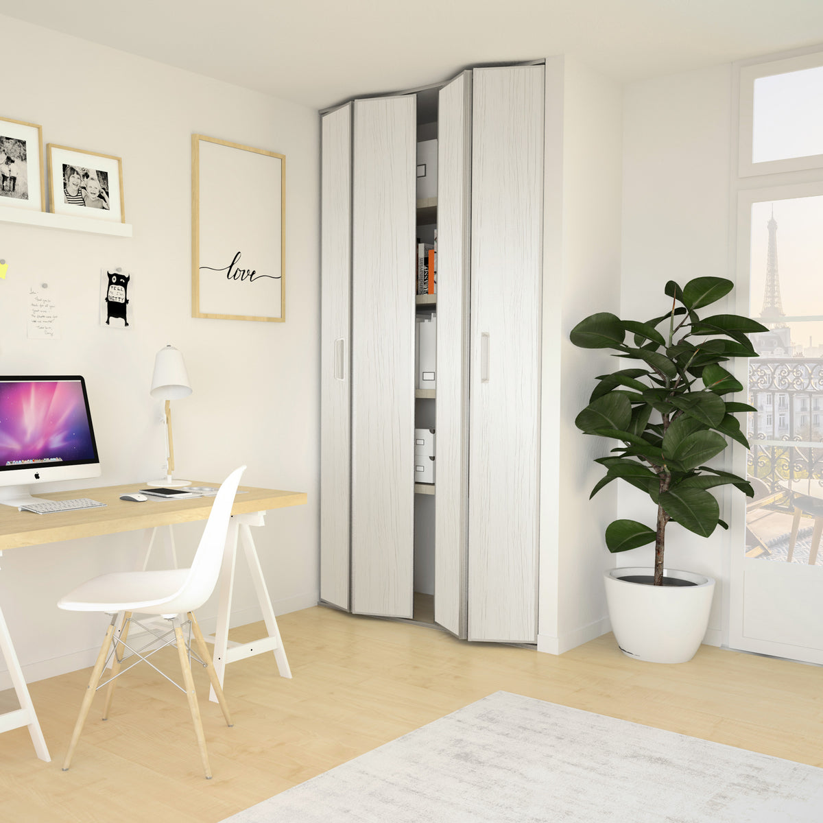 Le raffinement de ces portes de placard pliantes Kazed provient de son élégant et intemporel décor Zebrano blanc. Il est valorisé ici par des finitions en aluminium Alu naturel.