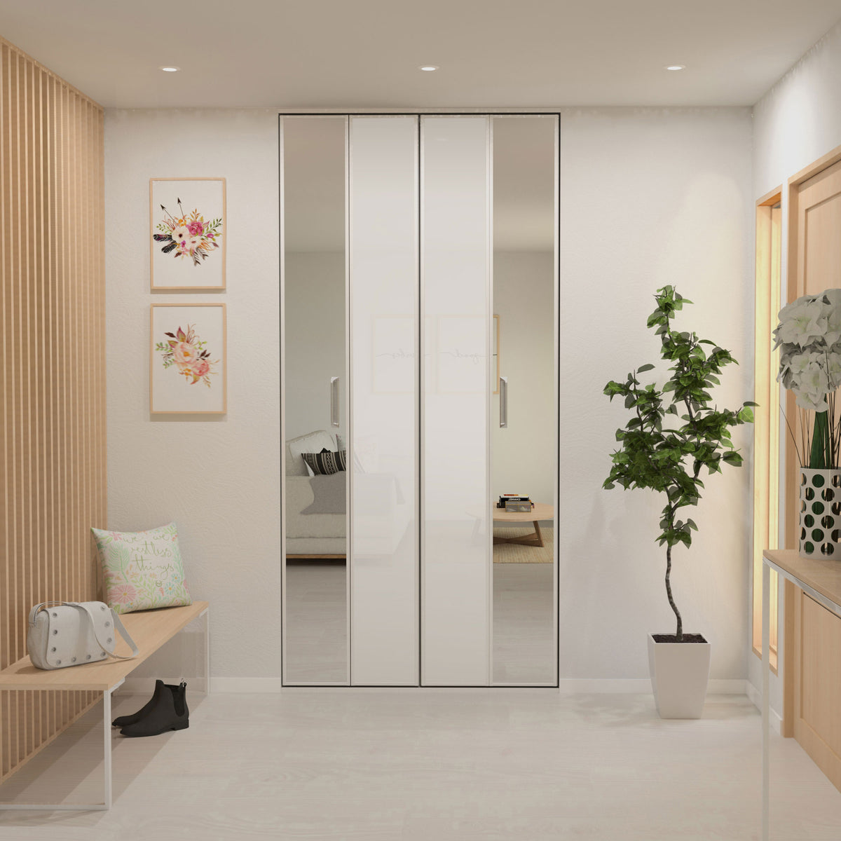 Les miroirs et le verre laqué blanc pur de cette porte de placard pliante offrent un design contemporain réussi. La structure haut de gamme est en aluminium blanc mat.