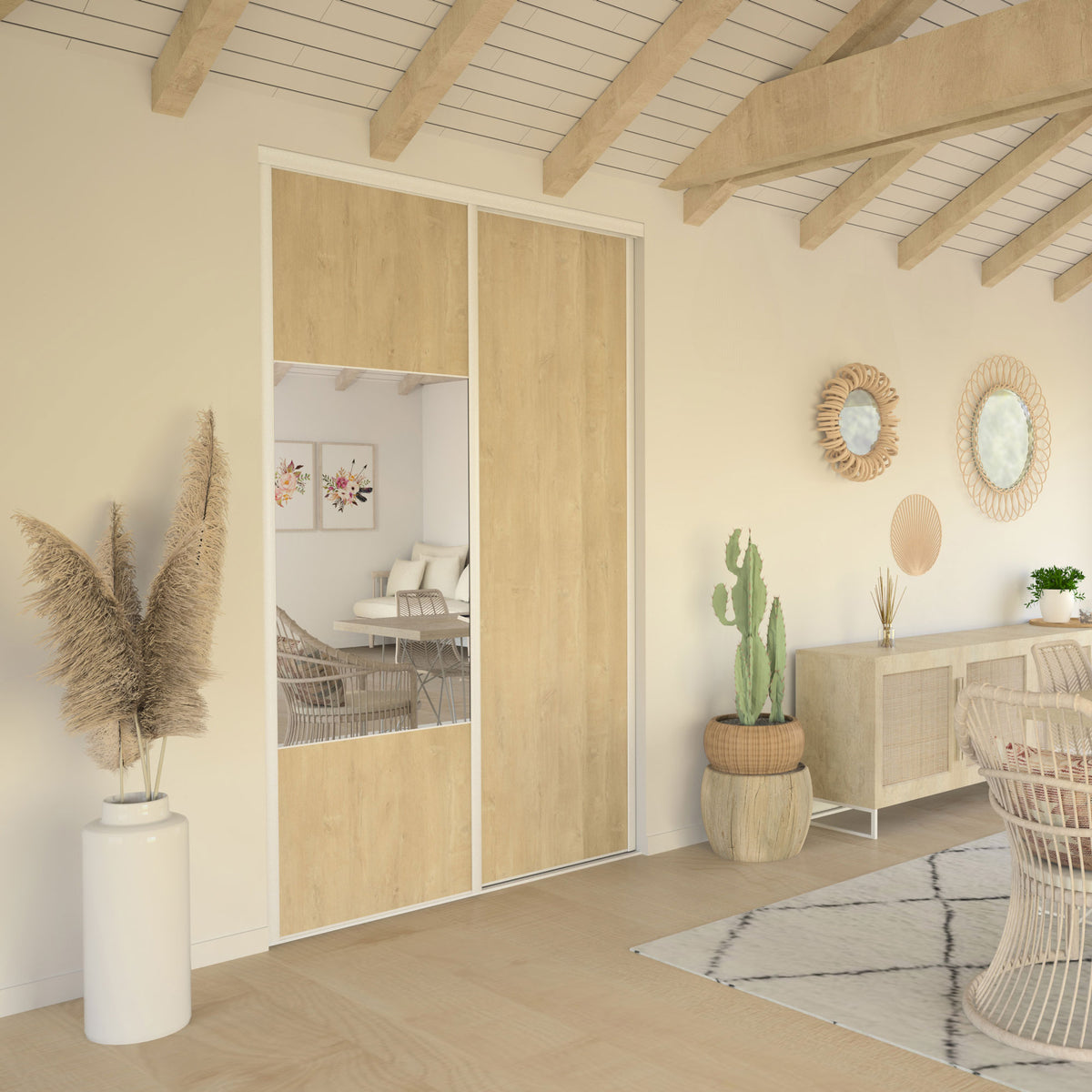 Vous avez une préférence pour les matières naturelles, alors craquez pour cette façade coulissante de deux portes en Chêne blond et aux finitions blanches. Une façade unique composée d'un miroir argent parfait pour agrandir et illuminer votre pièce.