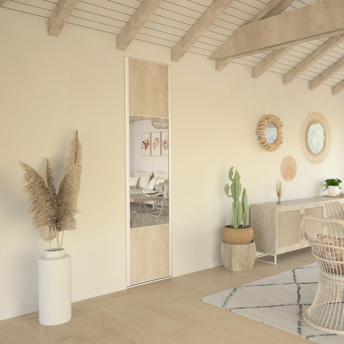 Craquez pour cette façade d'une porte pivotante à la fois douce et charismatique. L'association du décor Chêne Flanelle Brut au Miroir argent apporte à la fois authenticité et luminosité. Sa finition Blanc Mat créée une atmosphère accueillante et chaleureuse.