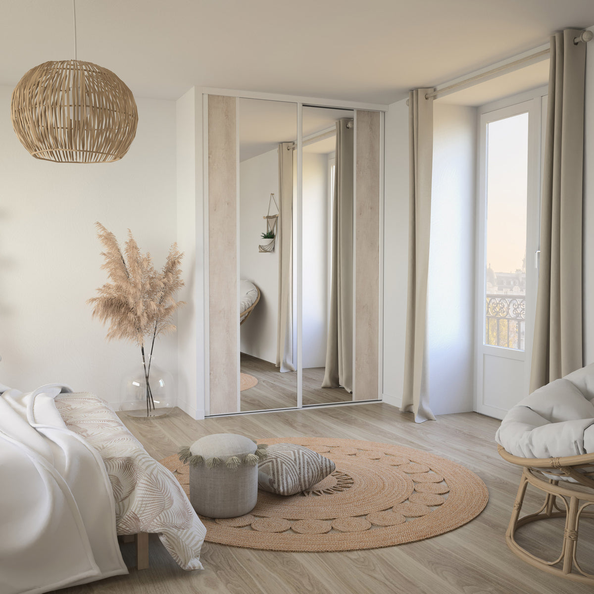 Quoi de plus paisible que ces portes de placard Kazed. Avec leur miroir Argent, le soleil va entrer dans votre chambre tandis que les décors effet Chêne flanelle brut apporteront de la douceur. Le tout est mis en valeur par des finitions en alu Blanc Mat.