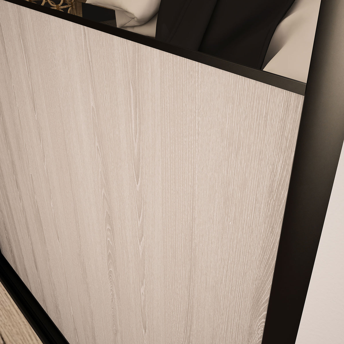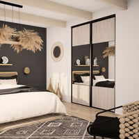 La finition des poignées, rails et traverses en aluminium Noir mat sublime les lumineux miroirs Argent et les décors Frêne tabac de ces deux portes de placard coulissantes. Cette façade Kazed s’intègrera avec élégance dans la pièce de destination.