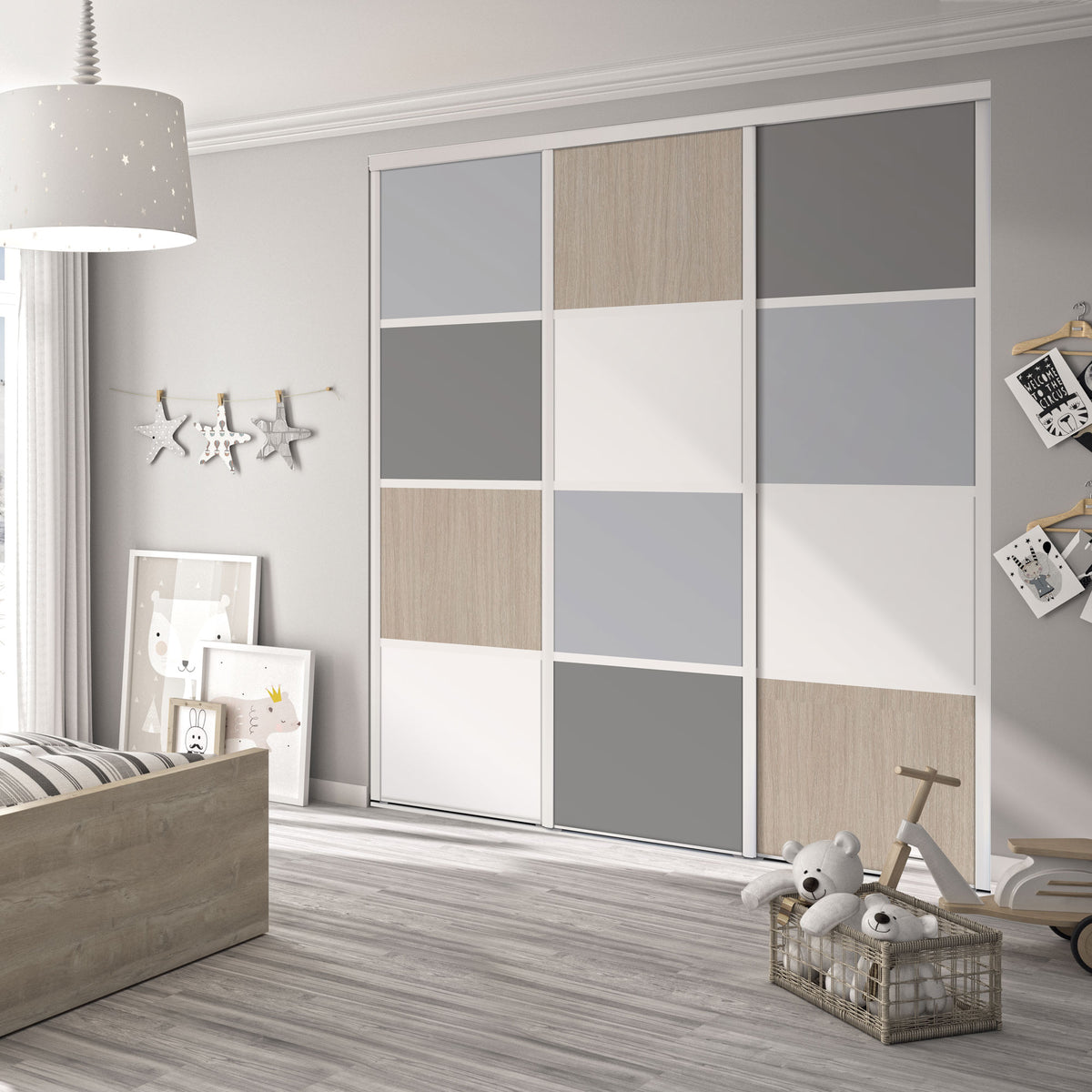 Cette façade de placard intemporelle sera idéale pour la chambre de votre enfant. Elle s'adaptera à tous les âges et pourra également être installée dans d'autres pièces de votre maison. Les portes gris galet, blanc mat, gris intense et effet bois patiné rose sont habillées d'acier laqué blanc et vous plongeront dans un univers très scandinave.