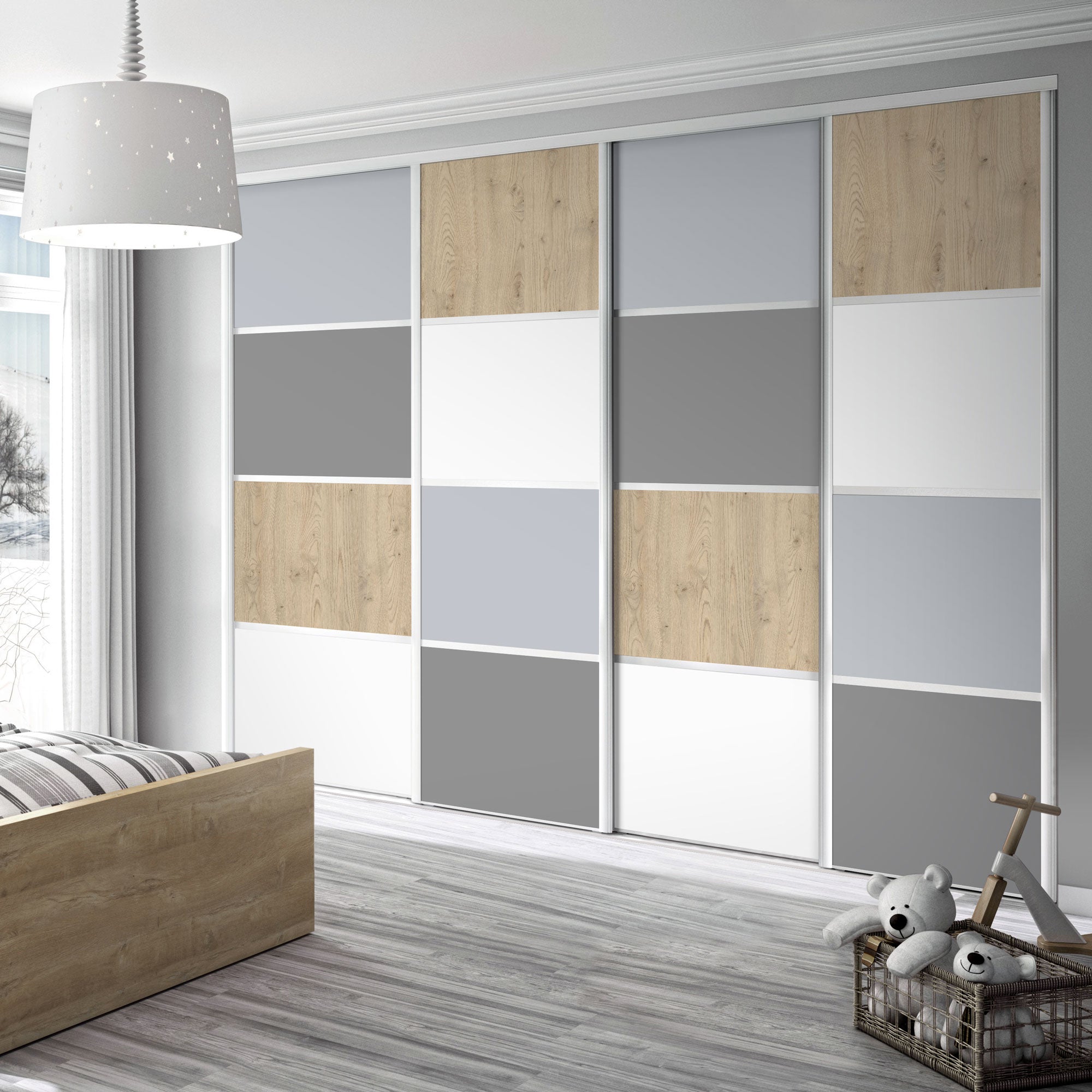 Avec ses tons neutres et élégants, cette façade de placard Kazed trouvera facilement sa place dans votre maison. Ses portes aux effets Châtaignier clair, Blanc mat, Gris galet et Gris intense sont habillées d´acier laqué Blanc. Intemporelle et mixte, elle sera également parfaite dans la chambre de votre enfant et plongera son nid douillet dans un chaleureux univers Scandinave.