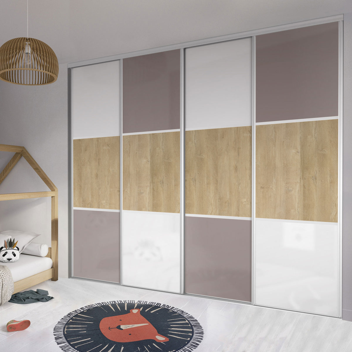 Vous êtes à la recherche de pratique et moderne. Vous avez trouvé ! Ici, on mélange les matières avec du verre laqué et du mélaminé pour obtenir ces quatre portes de placards coulissantes à la pointe de la mode. Le Chêne Blond mêlé au Blanc pur et au Café crème, et associés à une structure en Blanc Mat, met tout le monde d'accord pour dire que la chambre de votre enfant est digne d'être dans les magazines décos les plus en vogue.