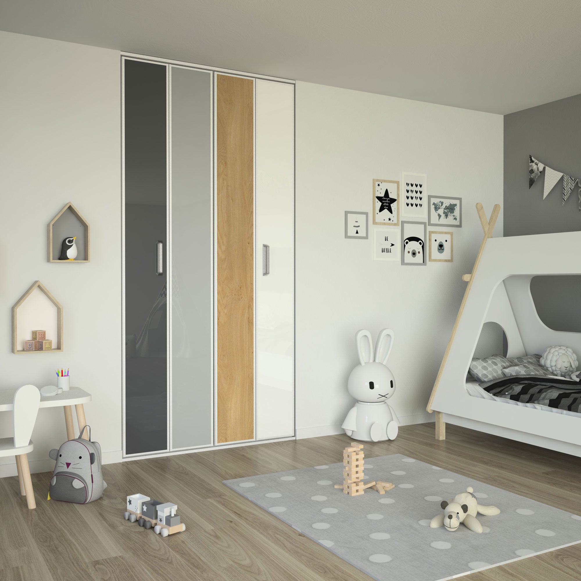 Succombez au charme quadricolore de cette façade de placard pliante ! Les verres laqués gris foncé, gris perle et blanc mat entourent un joli effet chêne naturel pour un rendu tout doux. L’aluminium haut de gamme qui entoure les portes est blanc mat.