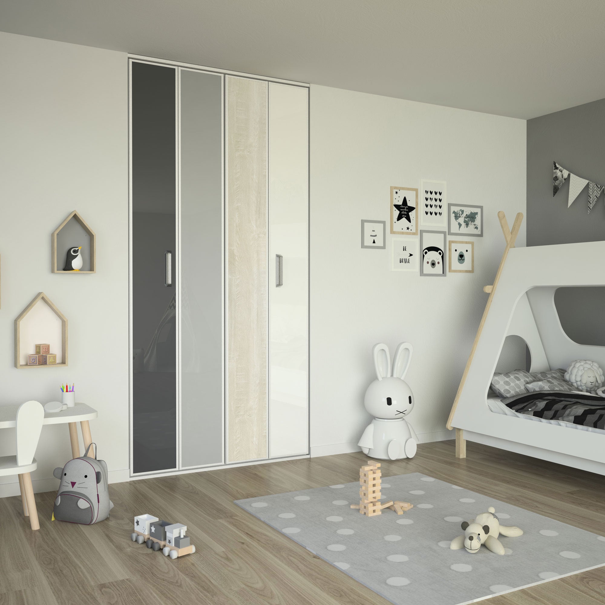 Dans une jolie structure en aluminium blanc mat, ces portes de placard pliantes savent se faire remarquer ! Elles sont décorées de verres laqués gris foncé, gris perle et blanc mat ainsi que d’un décor bois flotté crème du plus bel effet !