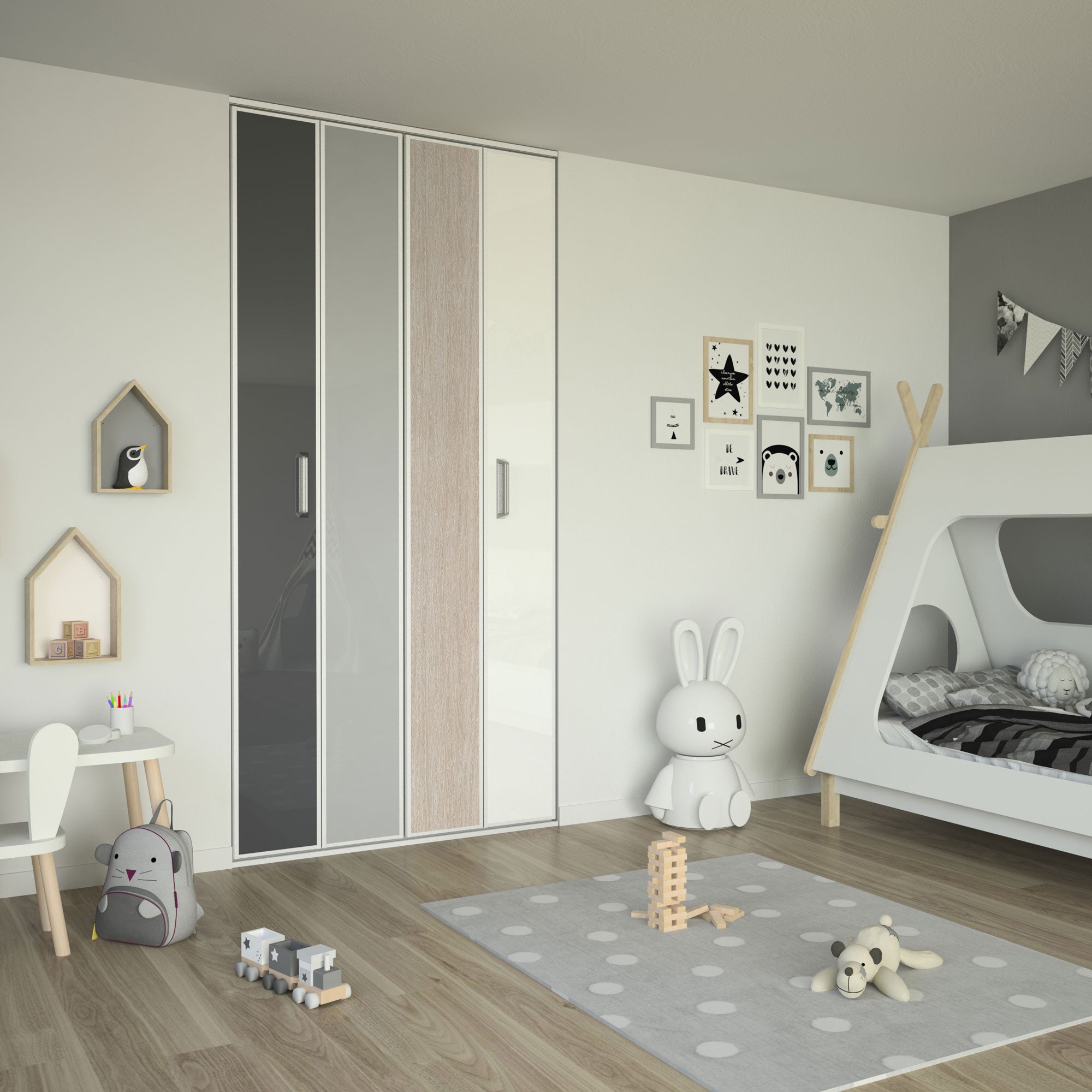 Les verres laqués gris foncé, gris perle et blanc pur de cette façade de placard mettent en lumière un décor effet bois patiné rose. Pour une ouverture fluide et silencieuse, la structure est en aluminium haut de gamme de couleur blanc mat.