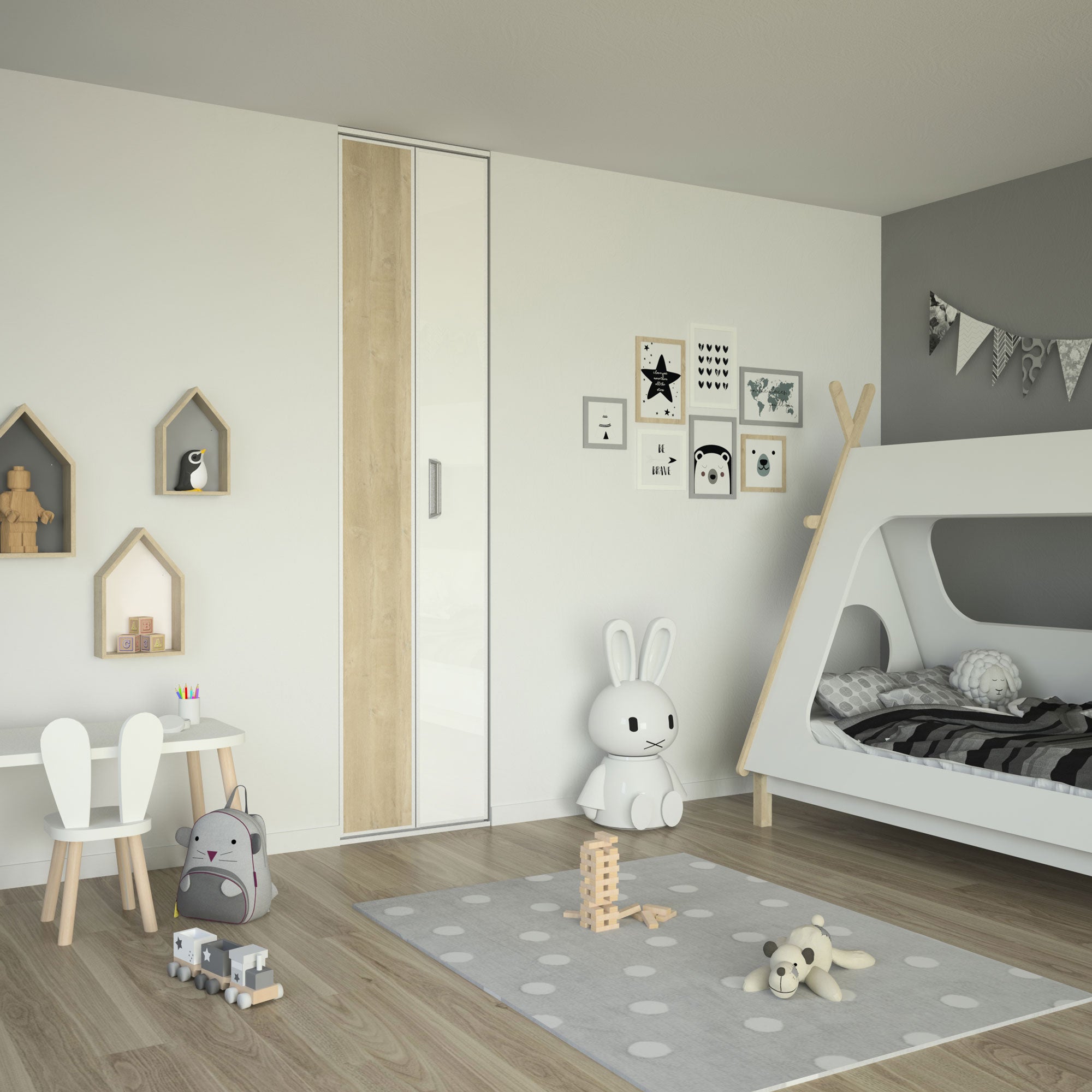 Dans un style Scandinave assumé, cette porte de placard pliante trouvera parfaitement sa place dans la chambre des enfants. Sa teinte chêne blond, son verre laqué blanc pur et sa finition haut de gamme en aluminium blanc mat en feront un incontournable déco !