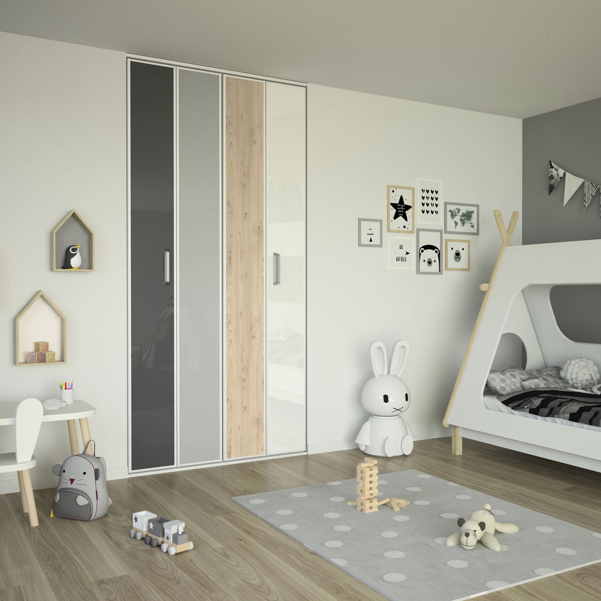 4 couleurs, 2 portes pliantes, une finition en aluminium Blanc mat et vous obtenez une façade de placard Kazed pleine de charme ! Les verres laqués Gris foncé, Gris perle et Blanc pur encadrent un chaleureux effet Châtaignier clair pour un rendu tout doux et élégant.