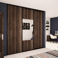 Craquez pour cette façade coulissante élégante et graphique. Le mélange harmonieux et chaleureux de l’effet Noyer des andes et du miroir Plomb est souligné par des finitions remarquables en aluminium Noir mat.