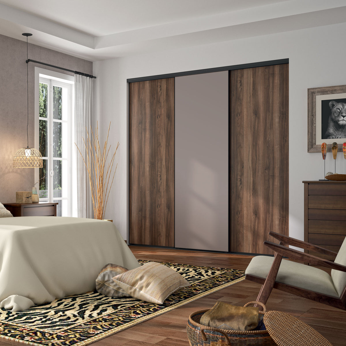 L'aluminium noir mat qui encadre la façade de placard Djibouti offre un rendu luxe indéniable ! Ces trois portes coulissantes sont décorées d'un effet noyer des andes allié au coloris moka.