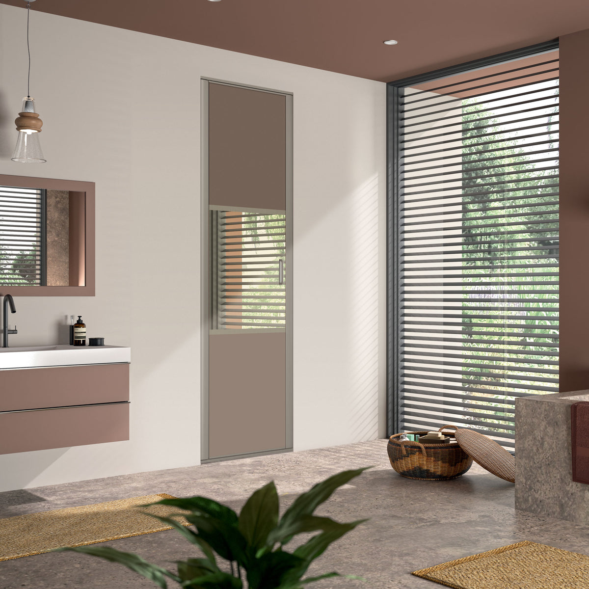 Tournez vos regards vers le Rwanda avec la façade de placard pivotante Kigali. La structure en aluminium sublime une porte couleur châtaigne et deux miroirs bronze.